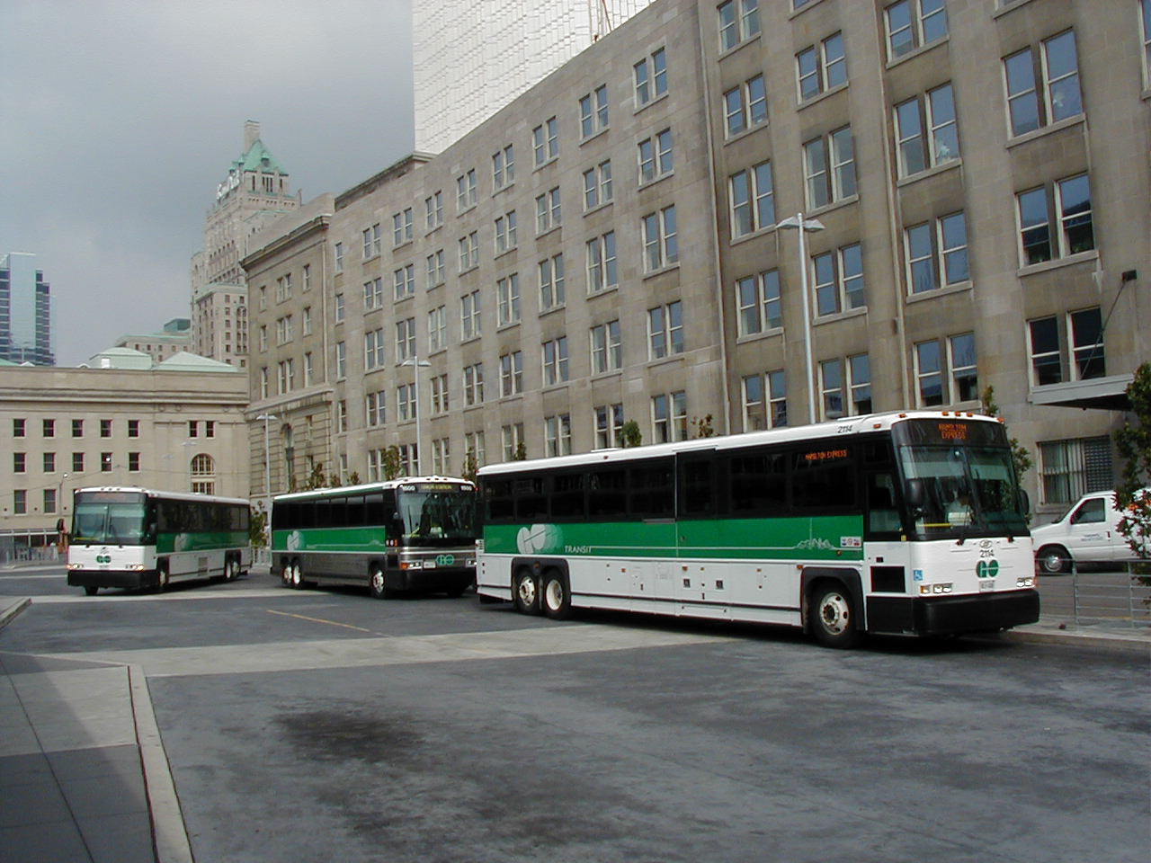 Contrasting liveries as this pair of predominantly white MCI sandwich a green one at the Bay Street, Union Station GO terminal in downtown Toronto. Nearest the camera is D4500 2134, only 18 months old when seen in this July 2003 view. The coach has already been withdrawn from service.