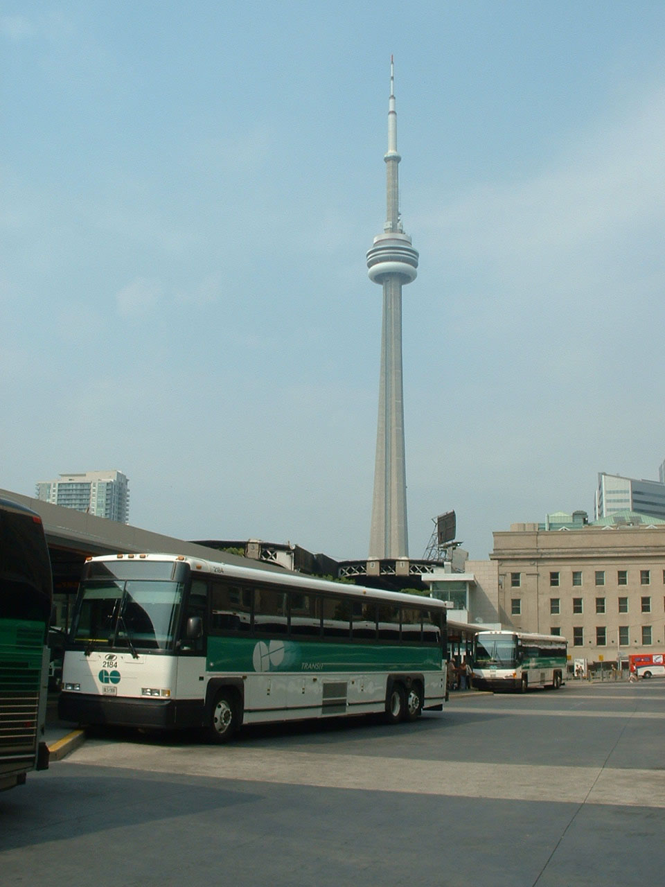 No less than 167 MCI D4500 were delivered in 2003, all now withdrawn. The CN Tower dominates the backdrop to the Bay Street GO terminal as it looks down on MCI 2184 in 2007.