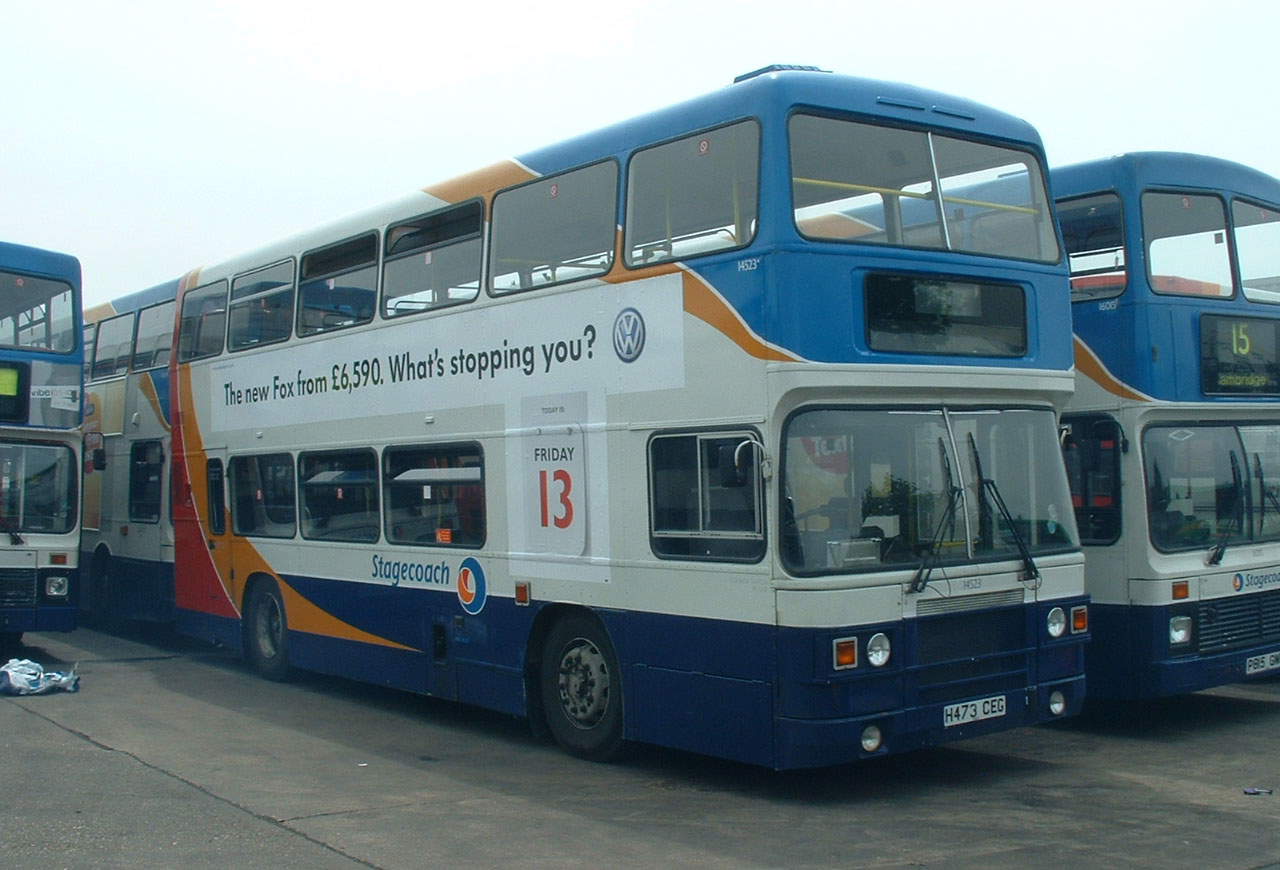 All Leyland Olympian 14523 (H473CEG) was new as B3 in the Peterborough based Viscount fleet of Cambus. It is seen in Cambridge depot in summer 2006.
