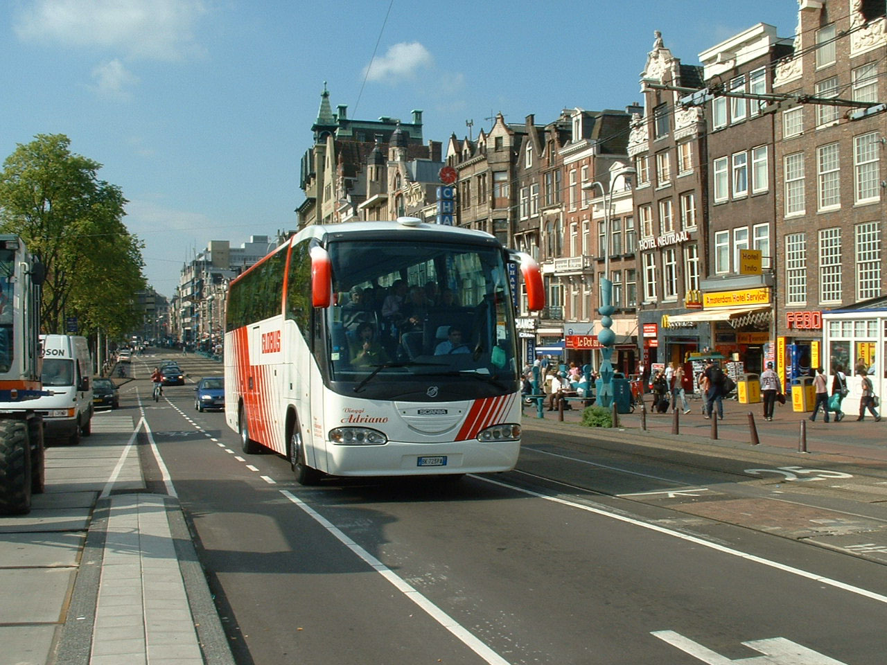 Seen in Amsterdam in late 2004 is Viaggi Adriano's Irizar Century bodied Scania, BK723PA, in Globus contract livery.