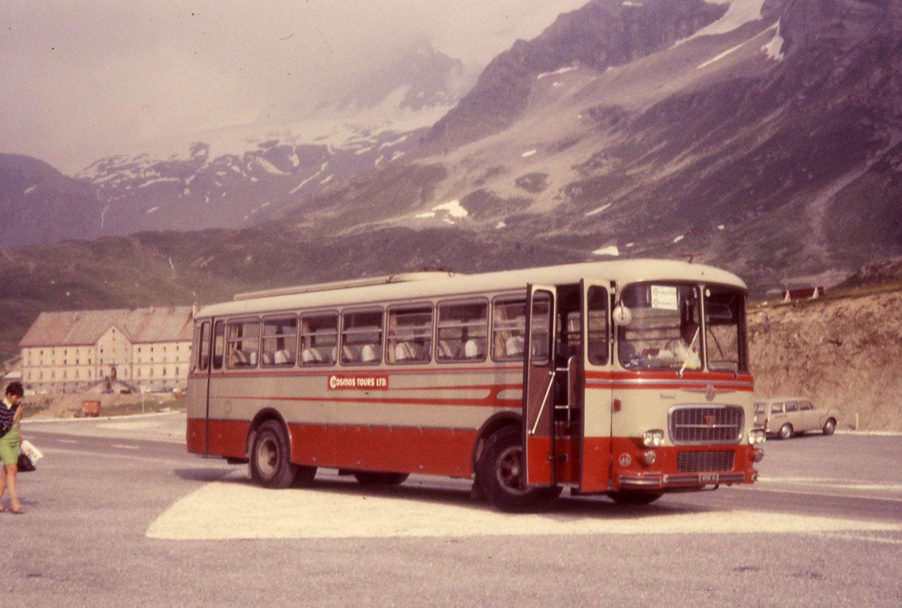 Crossing the Alps between Italy and Switzerland in August 1969 was this Fiat coach under contract to Cosmos UK holidays.