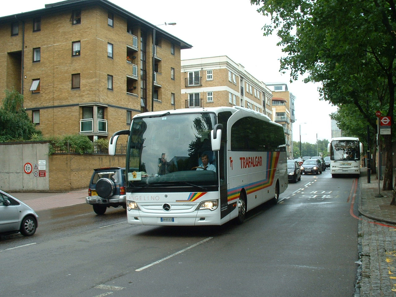 In London in July 2007 is baby Mercedes Tourino OH851EX of Angelino, in Trafalgar contract livery. In the background is a Motts Jonckheere Mistral bodied Volvo B10M. |
