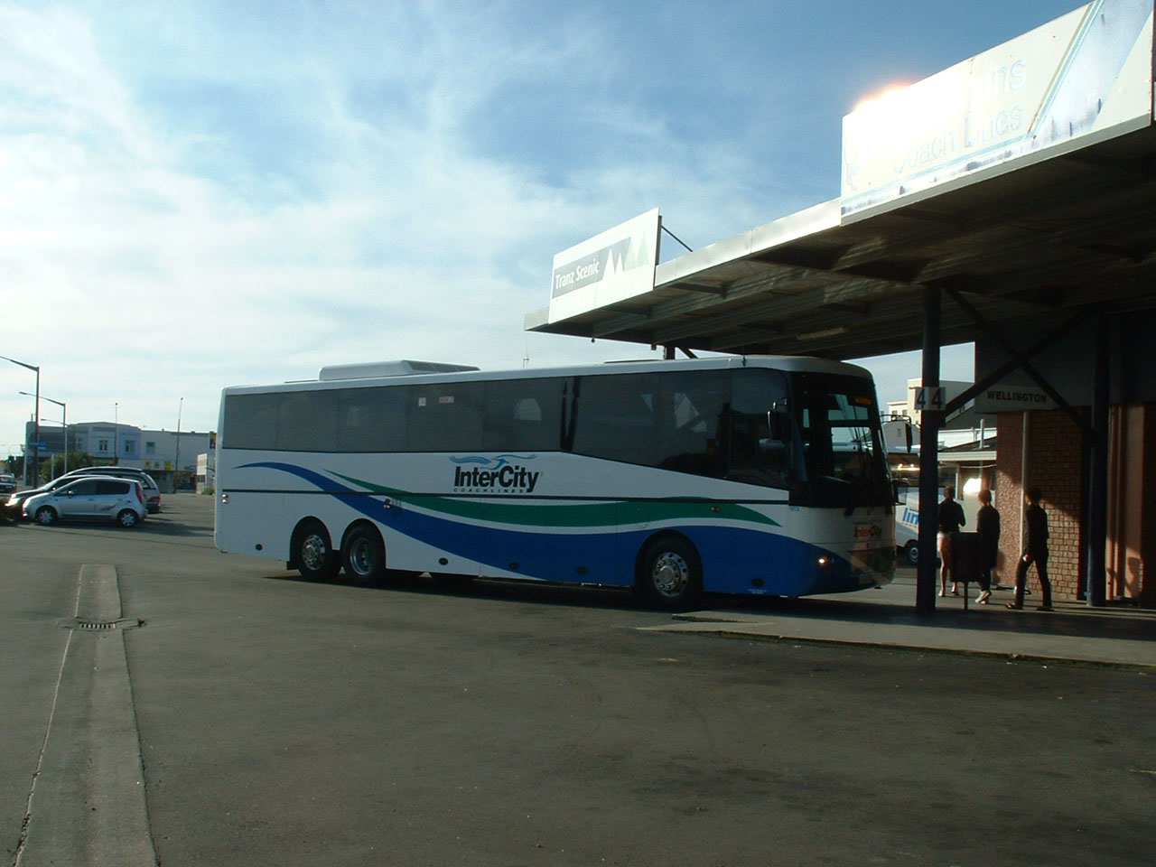 Another TraNZit Intercity coach, tri-axle Kiwi bodied Dennis Javelin, 1012 (ALY715) of 2002 seen in Wellington Coach Station in April 2008. |
