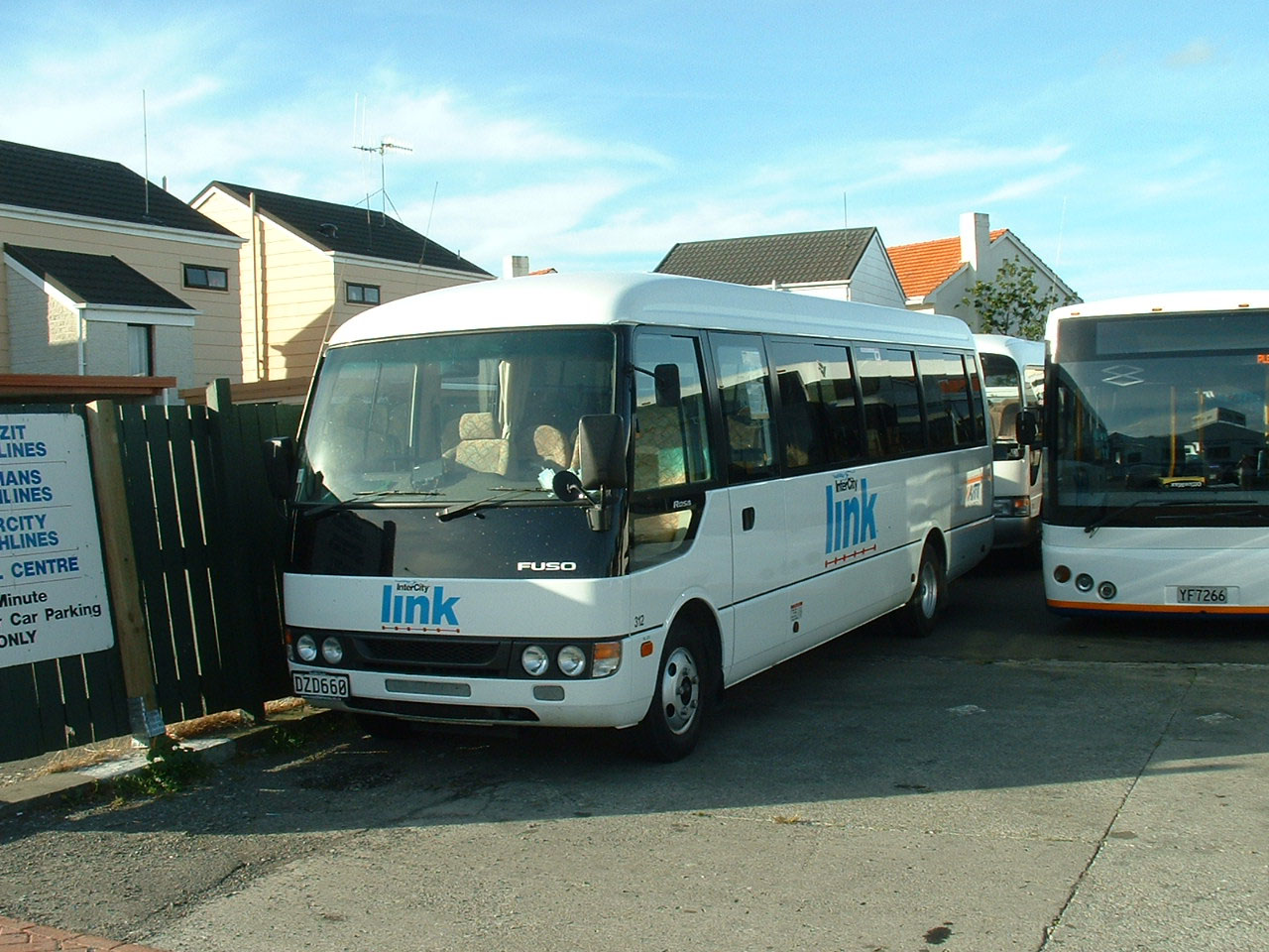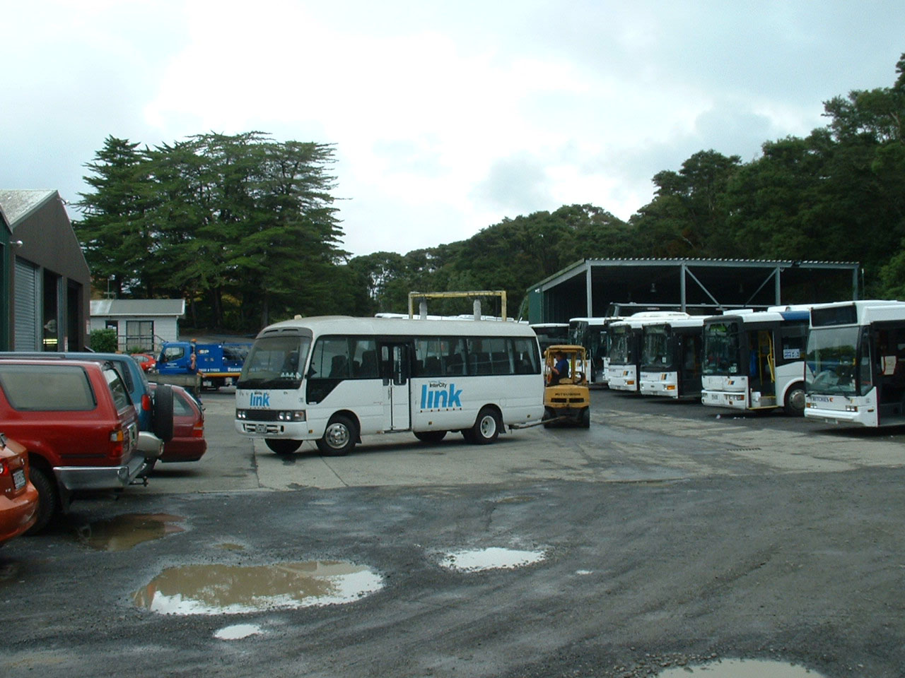 Small vehicles, like this Mitsubishi Rosa, DZD660, are used on feeder services under the "InterCity Link" name. The Rosa is in a yard with a Toyota Coaster behind and TraNZit's ex-Christchurch Designline bodied MAN 10.160 of 1999, 288 (YF7266). |
