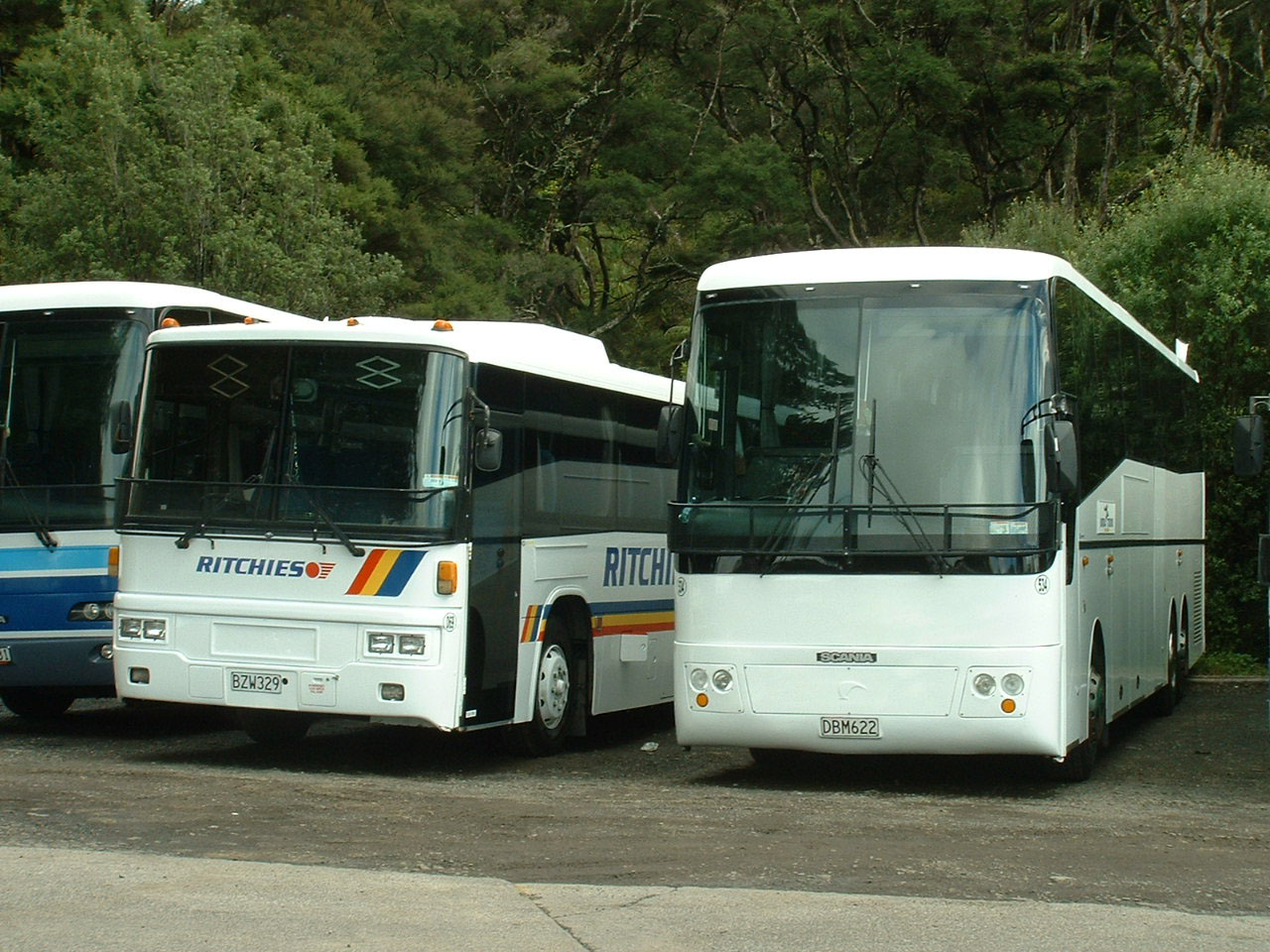 The 1995 37 seat Nissan Diesel UA440, 69 (BZW329), on the left ended its Ritchies' days in Rotorua (see later), but is seen in Albany depot in April 2008 alongside a plain white Kiwi bodied Scania K124IB 534 (DBM622) since re-registered LPB409 and ten years the Nissan's junior.