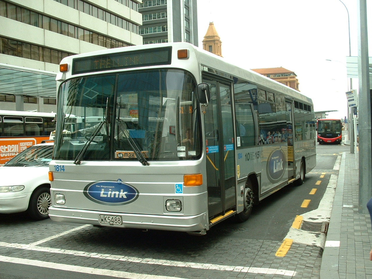 In April 2005, the Link branding was confined to the downtown loop services running clockwise and anticlockwise around the city. Unlike the Designline Omnicity electric vehicles in use at the time, this service was not free but did cover a wider area of the city. The base livery was now silver, as can be seen on Fairfax bodied 1814. The bus was seen five years earlier at the top of the page.