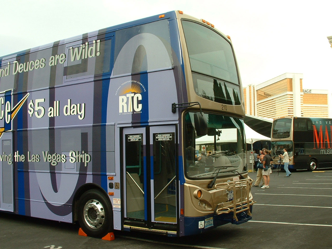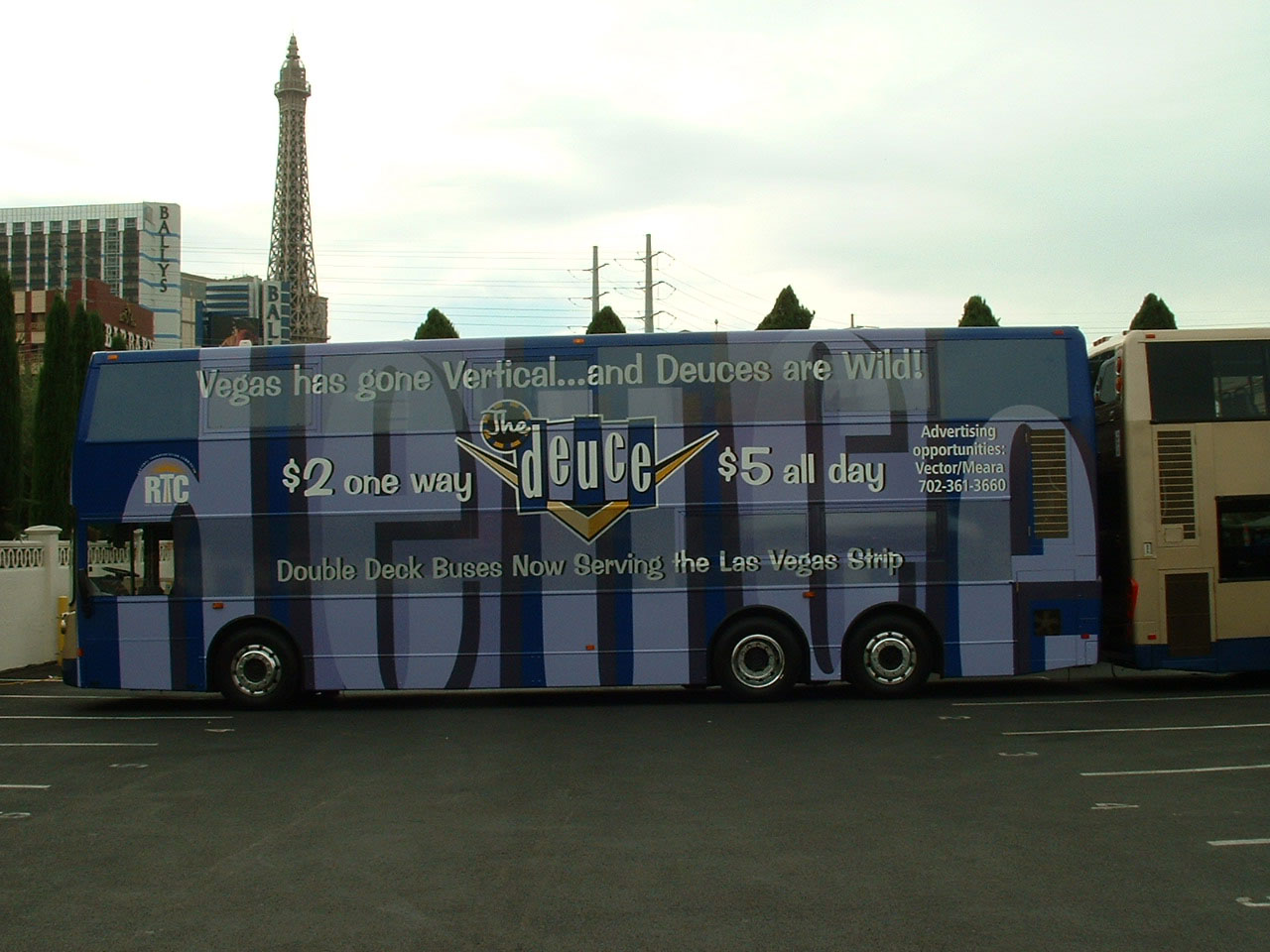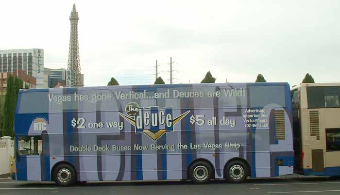 The broadside of 210, wth the Eiffel Tour to the left. The fares are a bargain, the $5 all day ticket allowing access to the entire CAT network. Kerbside ticket vending machines have been installed all along the Strip though drivers still issue tickets, unlike Central London.