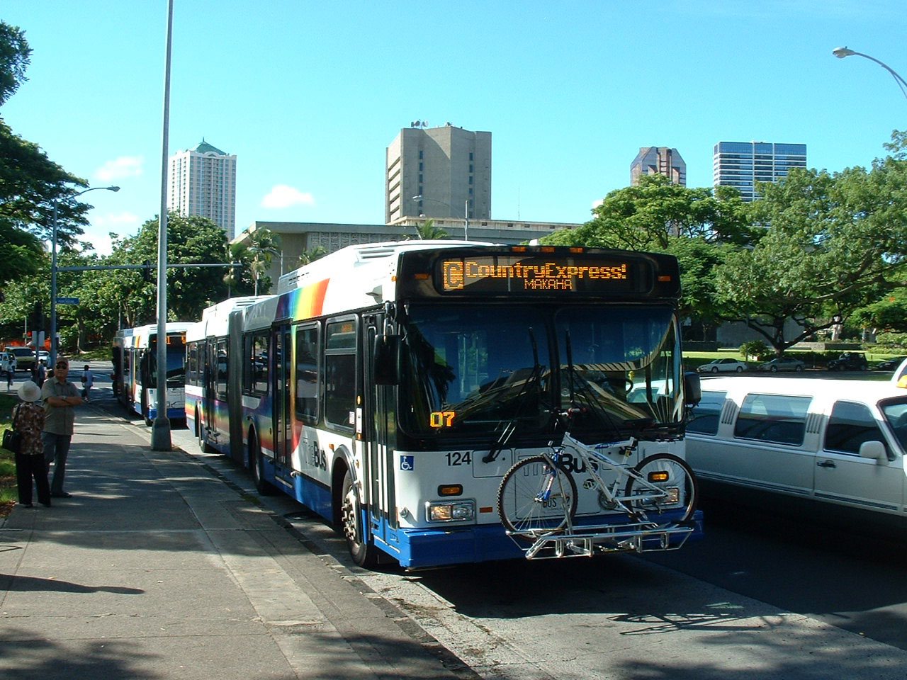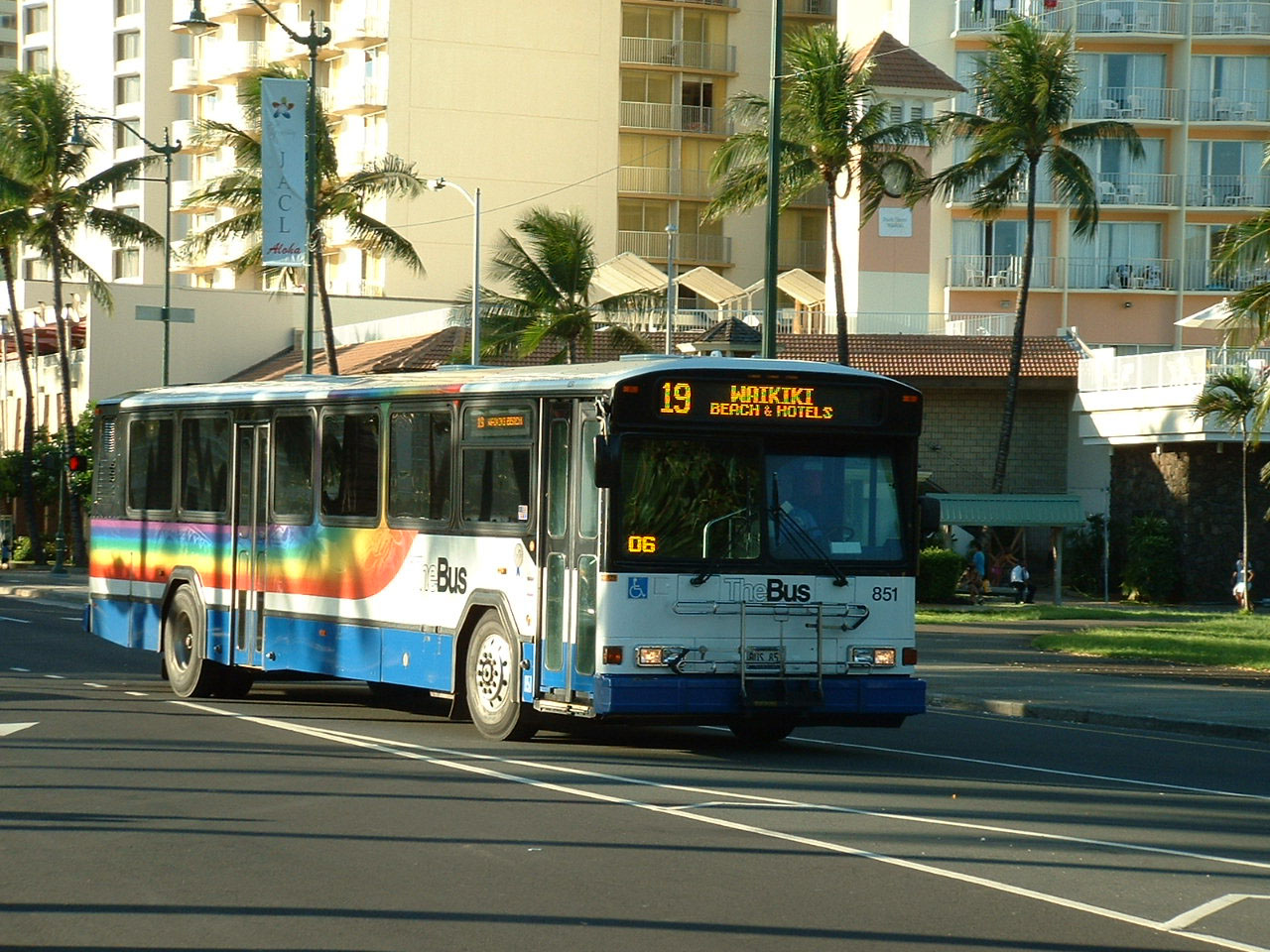Gillig 851 (BUS851). one of seventeen delivered the previous year, sports the new livery in downtown Waikiki.