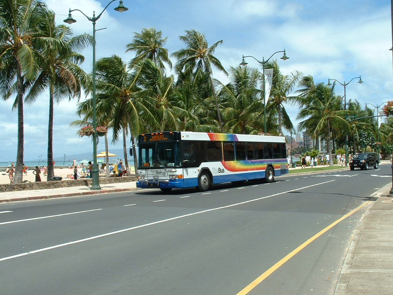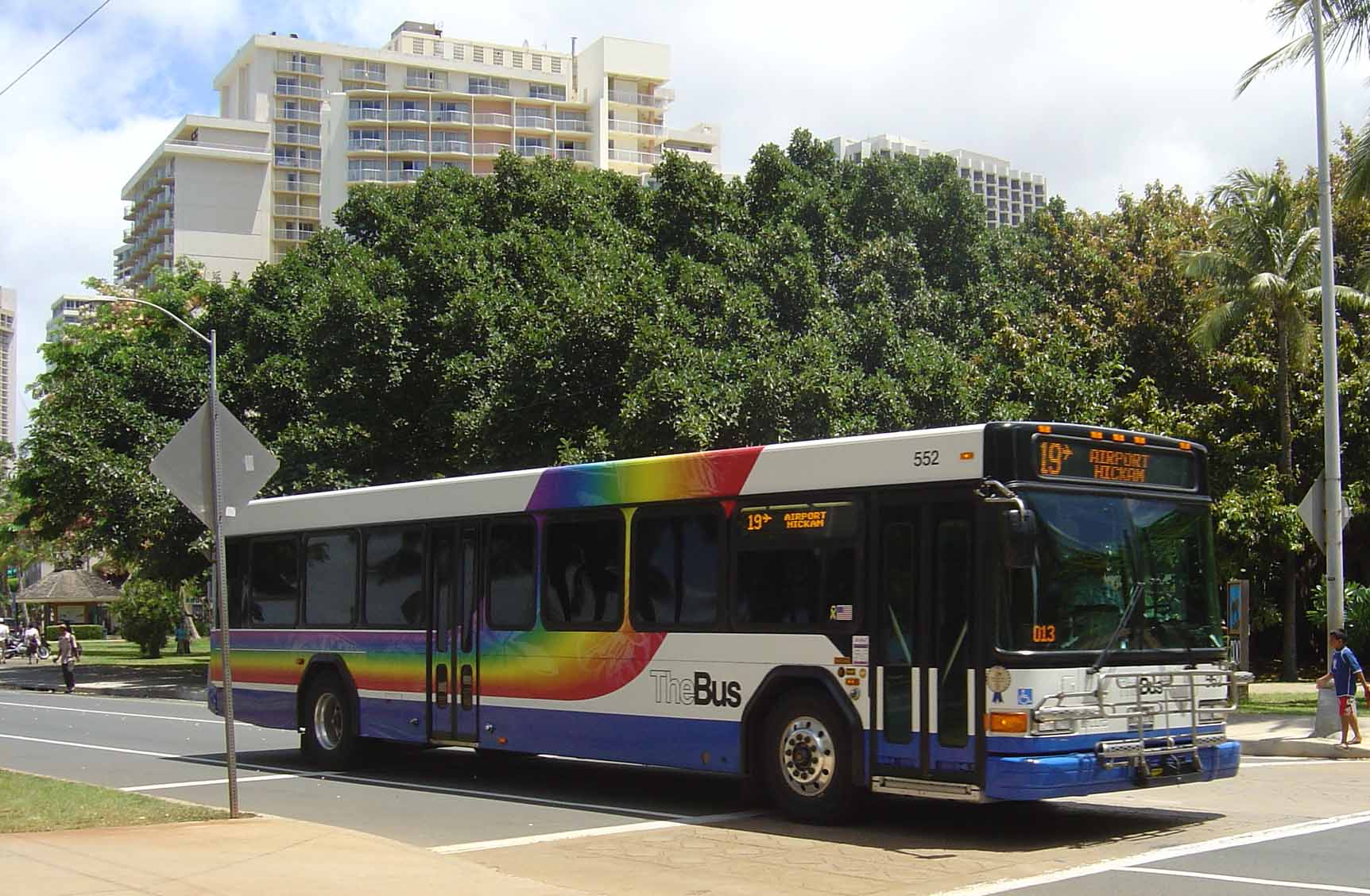 TheBus 552 (BUS552) approaches the parkland by Waikiki Beach. The batch of 55 was delivered over the 2003-2004 period and some have since been repainted into standard bus livery.