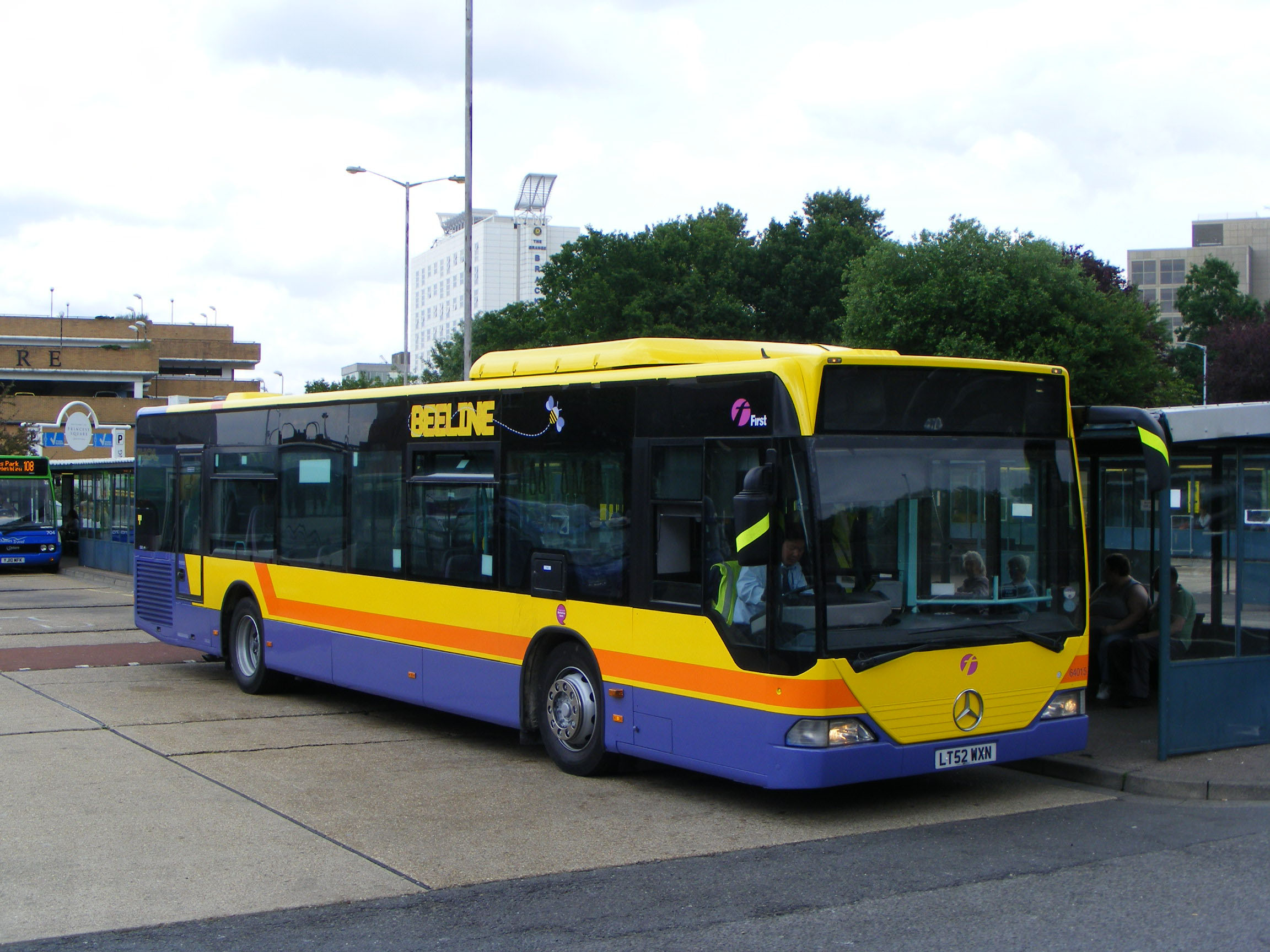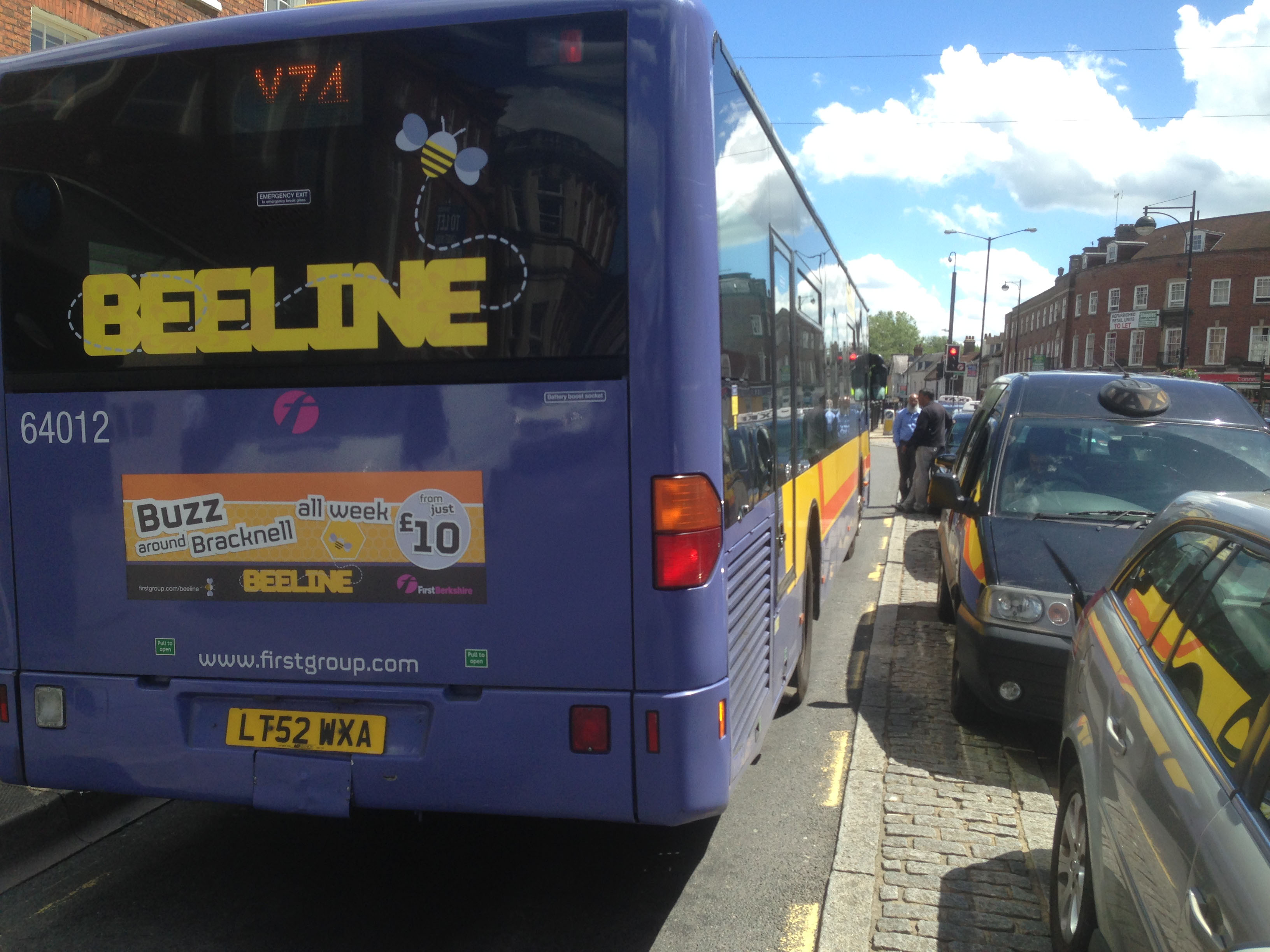 In 2013 a liberated First started to abandon its corporate livery and began using different colour schemes for marketing purposes. With town services under attack from competitor, Courtney Buses, First revived the yellow Beeline livery on Mercedes Citaro buses rendered surplus from Heathrow services following the delivery of hybrid Volvos. Seen in Bracknell Bus Station in June that year is 64012 (LT52WXA). |