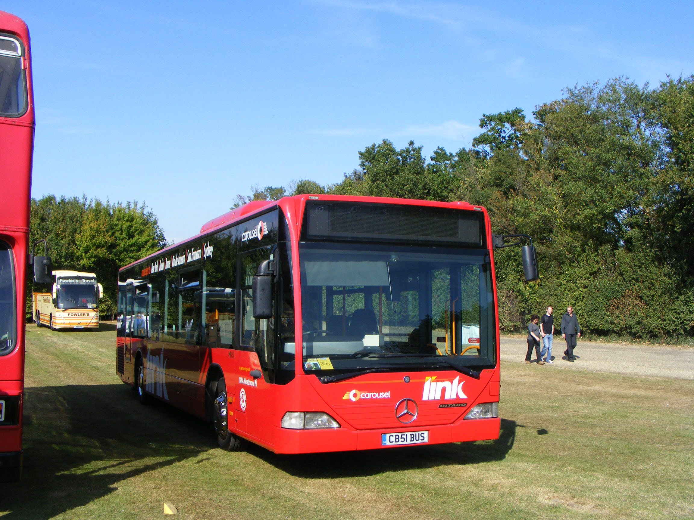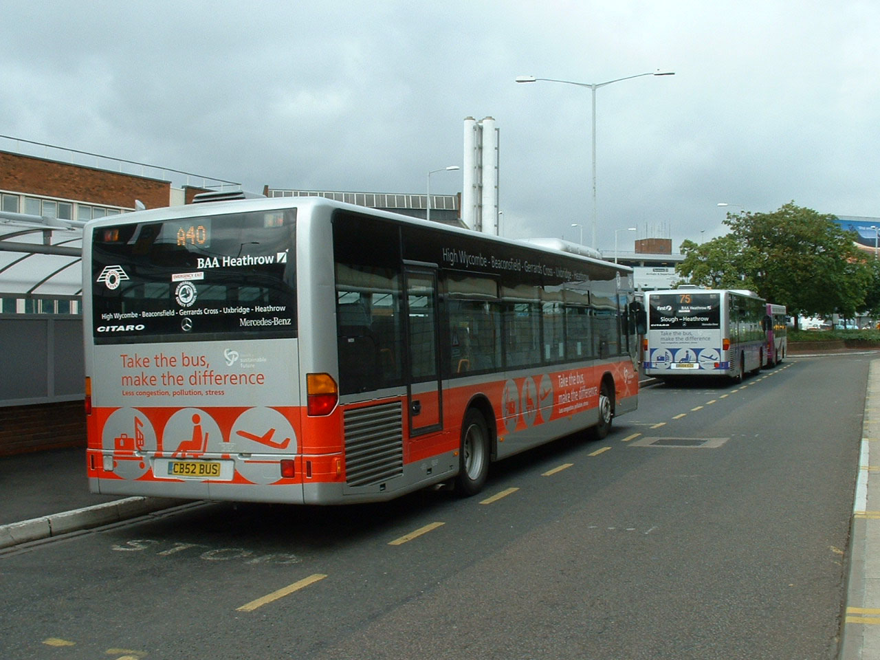 An August 2004 view of MB52 (CB52BUS) at Heathrow shows the vinyls that had by then been deployed on the fleet. matching the ones used by First Beeline, one of whose Citaros can be seen in front. |