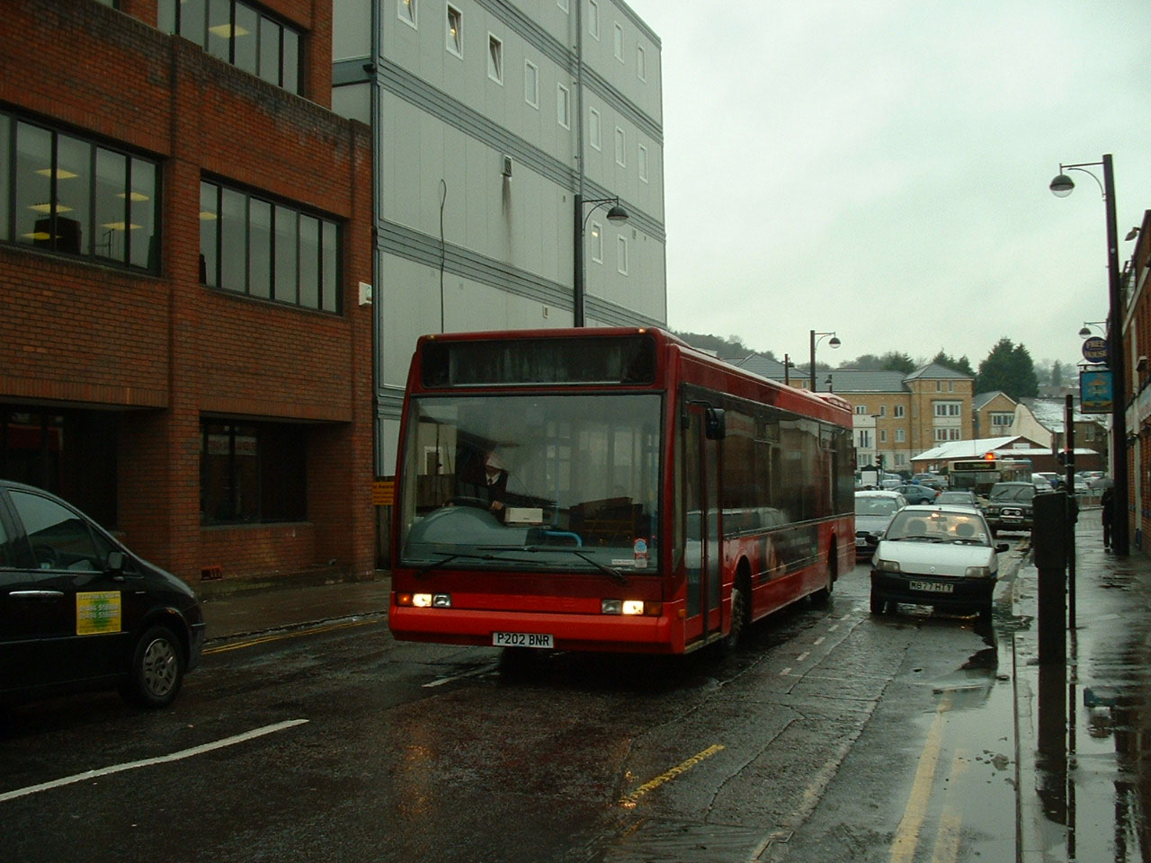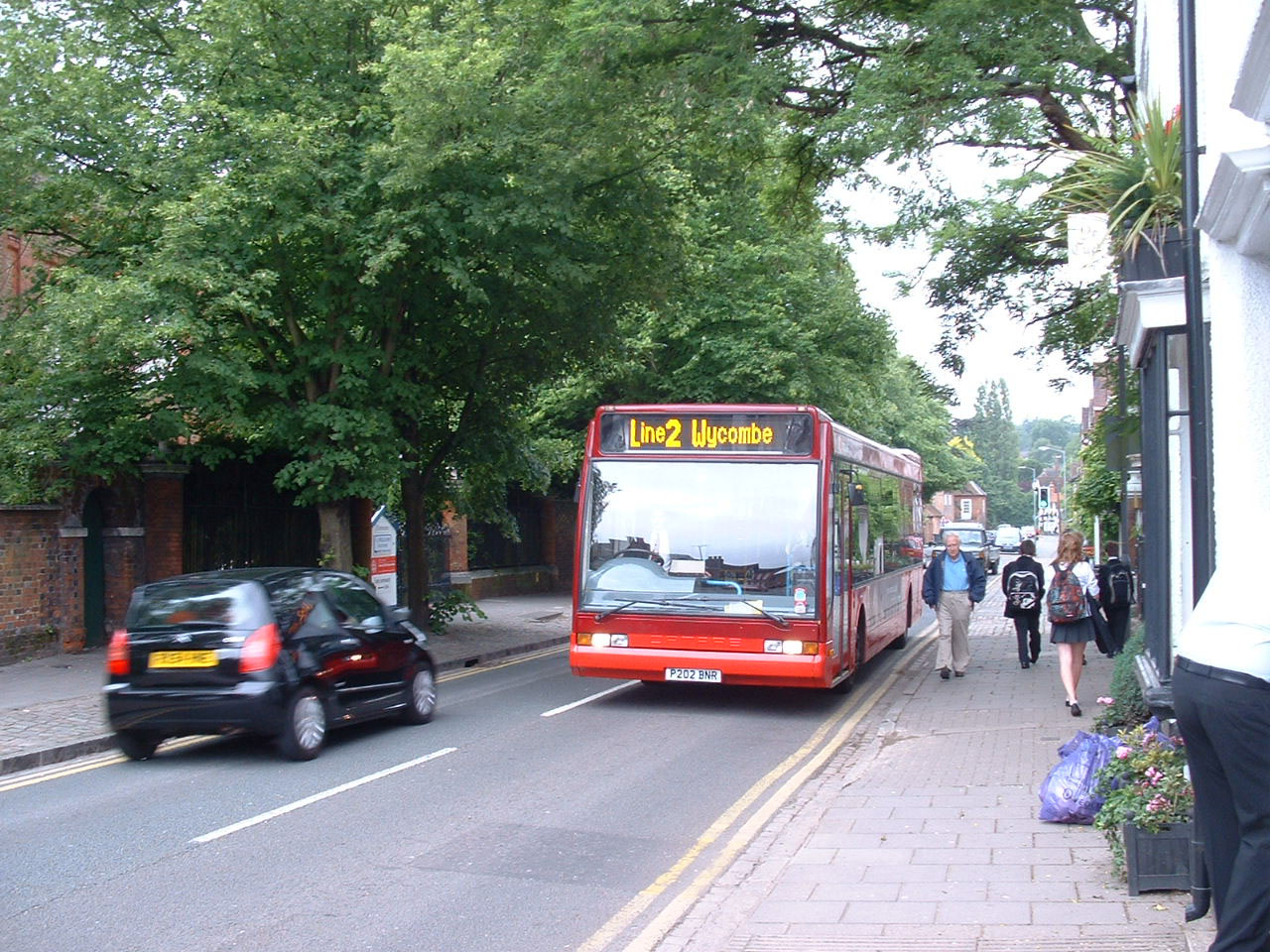 Four months later, and still bereft of fleetnames, the former Trent Optare, 202 (P202BNR), is earning its keep on Line 2 in West Street, Marlow. |