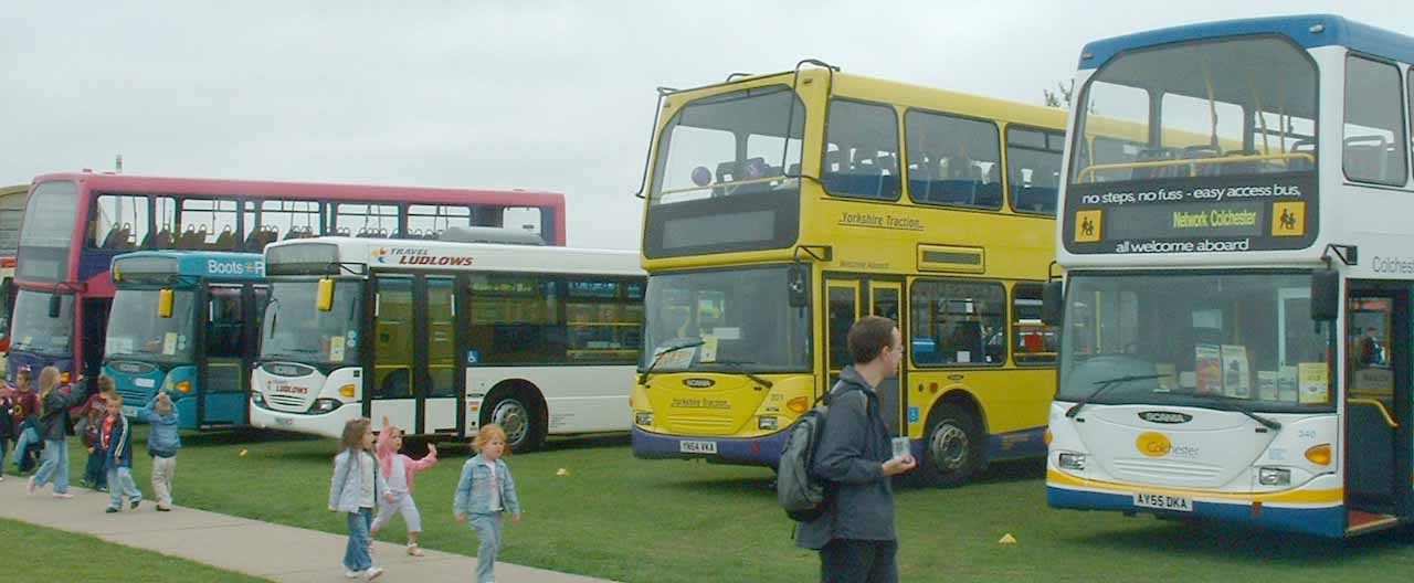 It was a Scania Omnifest at SHOWBUS in 2005 with Network Colchester's newly delivered East Lancs Omnidekka, 340 (AY55DKA). Alongside are Omnis from Yorkshire Traction, Ludlows, Nottingham and Uno. |