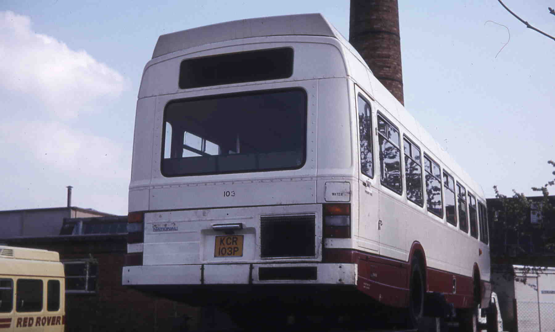 The initial trio of Nottingham Nationals, 132-134 dating from 1973 were exchanged for 1976 machines from Portsmouth which were conveniently numbered 152-154. The Nottingham trio was driven down to the south coast and swapped for the Portsmouth buses, the old Red Rover Nationals going for scrap in their stead. Here Portsmouth 103 (KCR103P) is receiving attention on the Red Rover hoist in the yard prior to being transformed into 152.