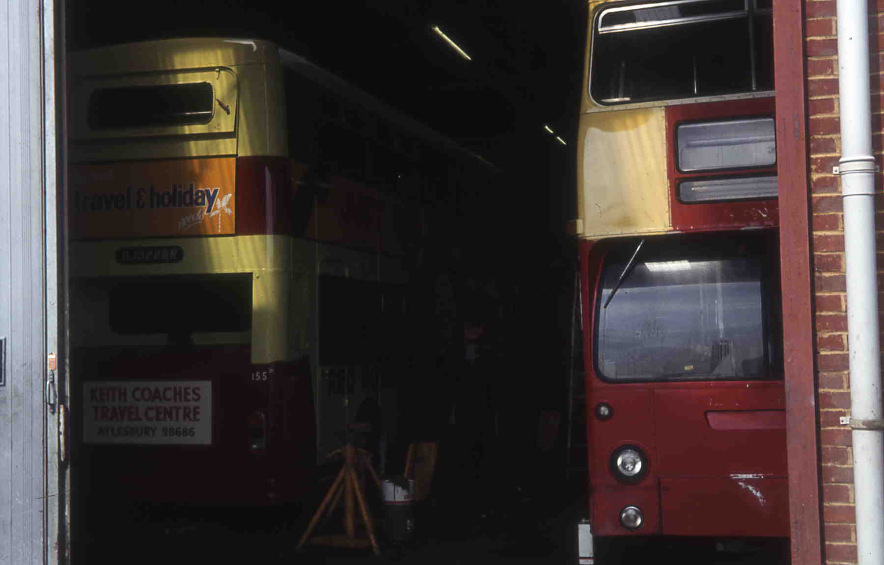 The two Easter 1983 arrivals are seen being prepared for service in Middle Garage. Already numbered 155 (OJD228R) is alongside 156 (OJD233R), former DMS2233 still showing London red. The MCW bodied Leyland Fleetline moved around a few London depots, but spent a lot of time out of service and was withdrawn after just over five years. It passed to Luton & District, becoming 708, but suffered accident damage after a year and was withdrawn for spares. Interestingly its remains passed to Green Rover of Watford in 1989.