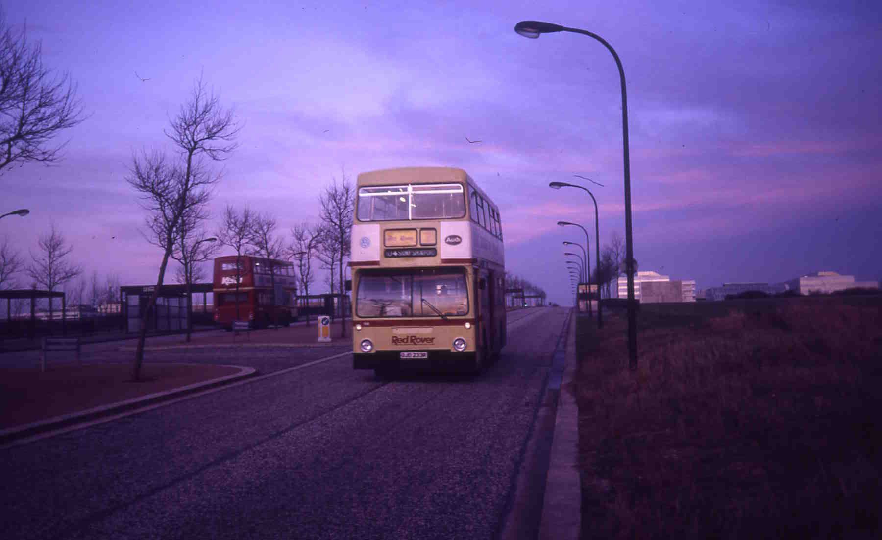 Red Rover operated the bulk of Milton Keynes city services on Sundays. The DMS bues were the usual performers, leaving Aylesbury depot around 7.00am and returning around midnight. Drivers were ferried over mid afternoon to change the crews. Unfortunately the fuel tanks were not quite able to cope with 17 hours continuous operation and depending on whether the tank had been topped to the brim the night before or not the odd bus would run out of diesel half way home! The bus is seen in Milton Keynes Bus Station, not on Sunday services, but the 515 Market Day express service from Great Missenden, Tring and Leighton Buzzard. |