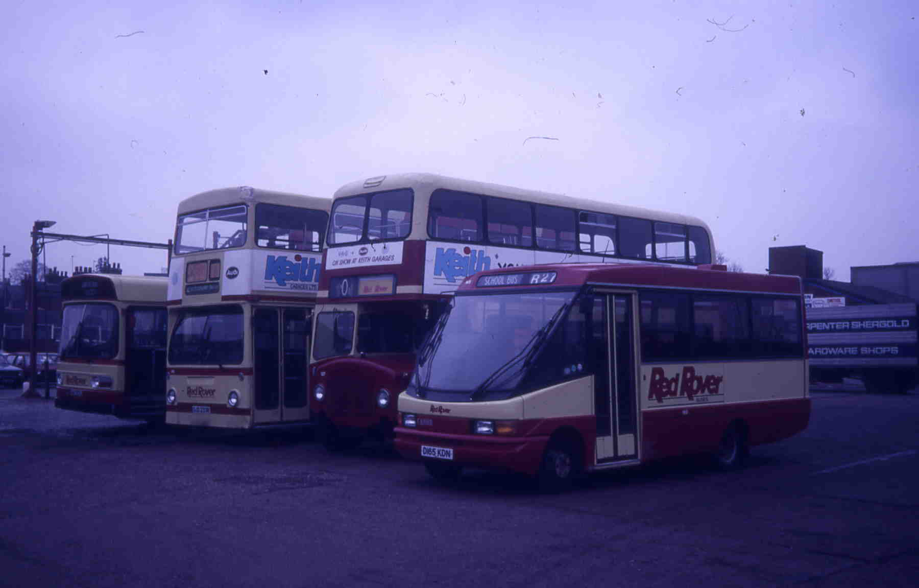 This yard shot has 156 with a near complete selection of the Red Rose fleet at the time: Optare City Pacer 165 (D165KDN), AEC Renown 127 (DAU358C) and a Leyland National.