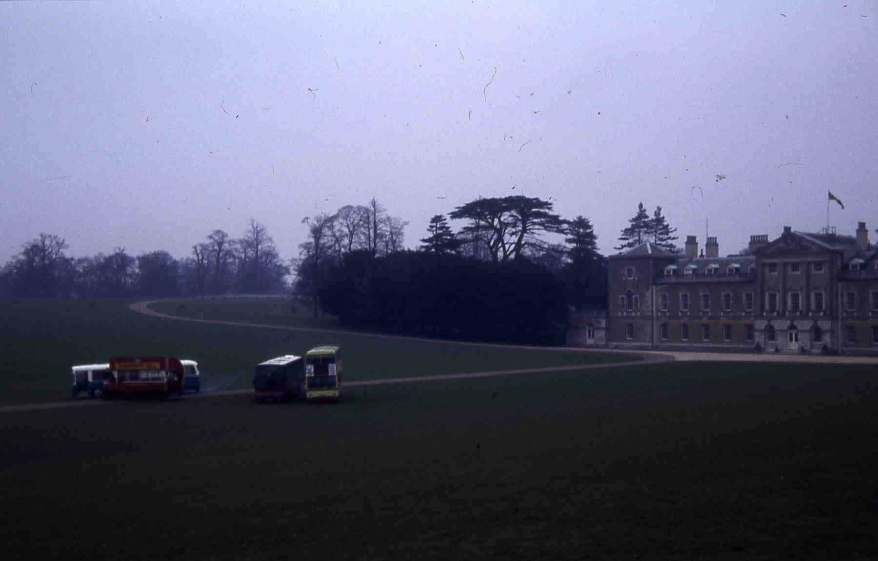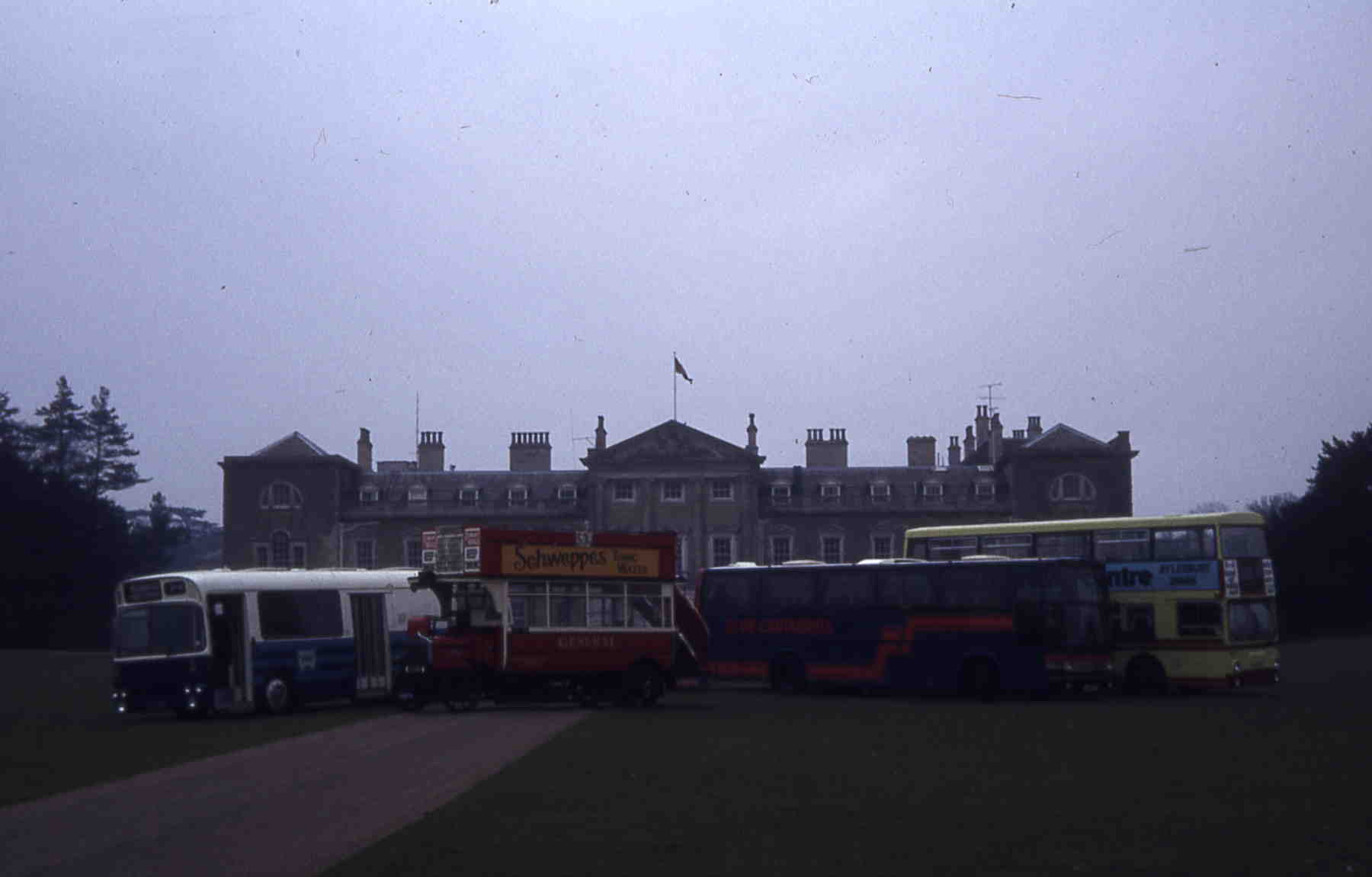On an unfortunately gloomy day in 1983 156 gathered with three other vehicles for a SHOWBUS photo shoot at Woburn Abbey. Alos taking part were Barry Weatherhead's General AEC K502 (XC8117) which is kept nearby, sponsor Hefac's ex Tyne & Wear Alexander bodied Leyland Panther converted to a mobile display, former 511 (UVK511G) and a Club Cantabrica Jonckheere bodied Volvo. This was the pose that became the SHOWBUS poster, the printers miraculously converting the sky to a cloudless bright blue.