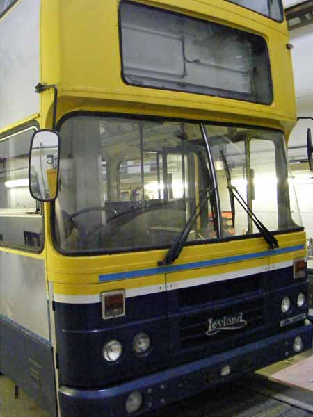 The first two Olympians that arrived with Motts Travel were Leylands. This unidentified example, thought to be RH166, is in their workshops being prepared for service. This included repanelling where necessary, repainting and removal of the centre door.