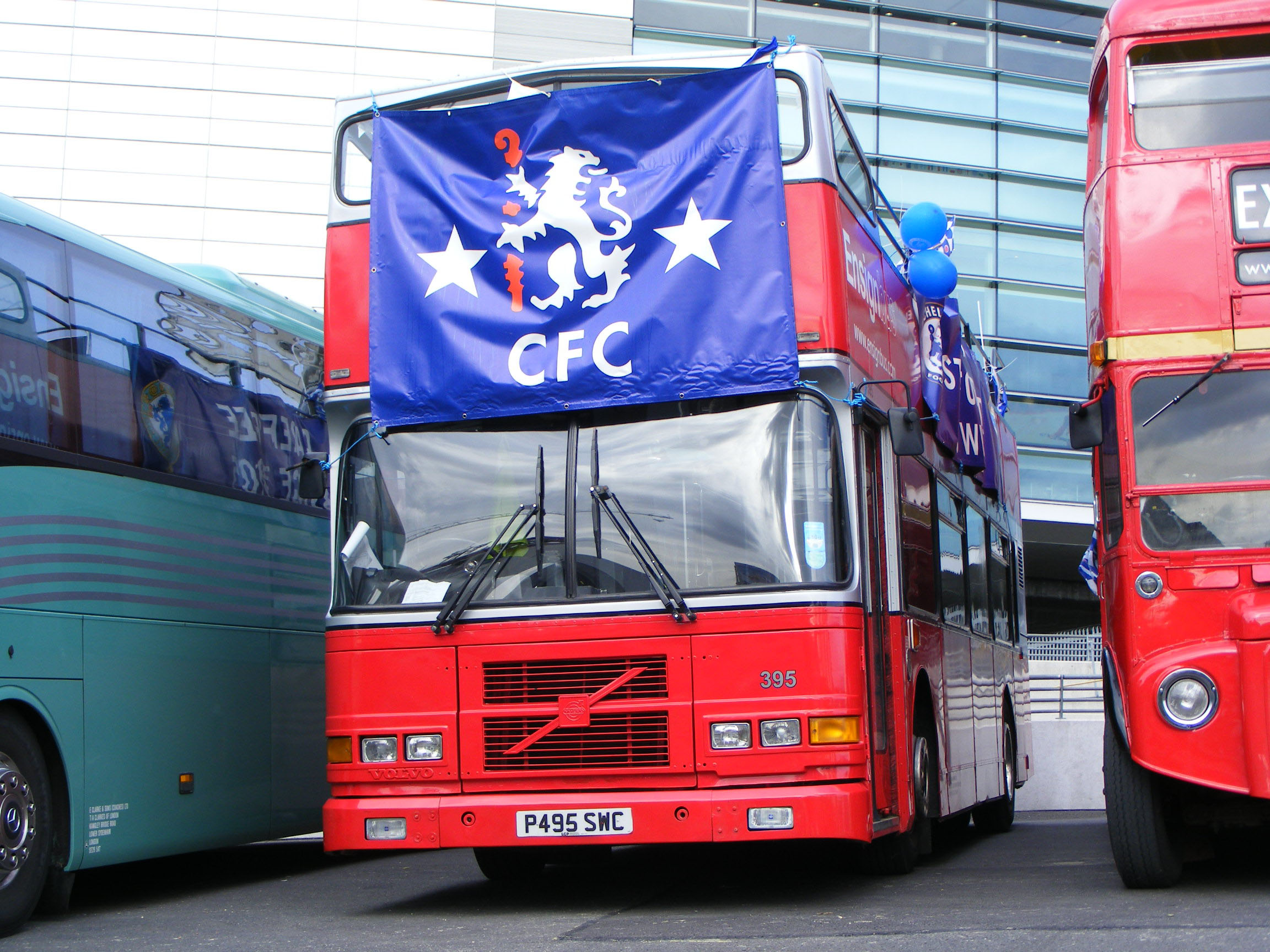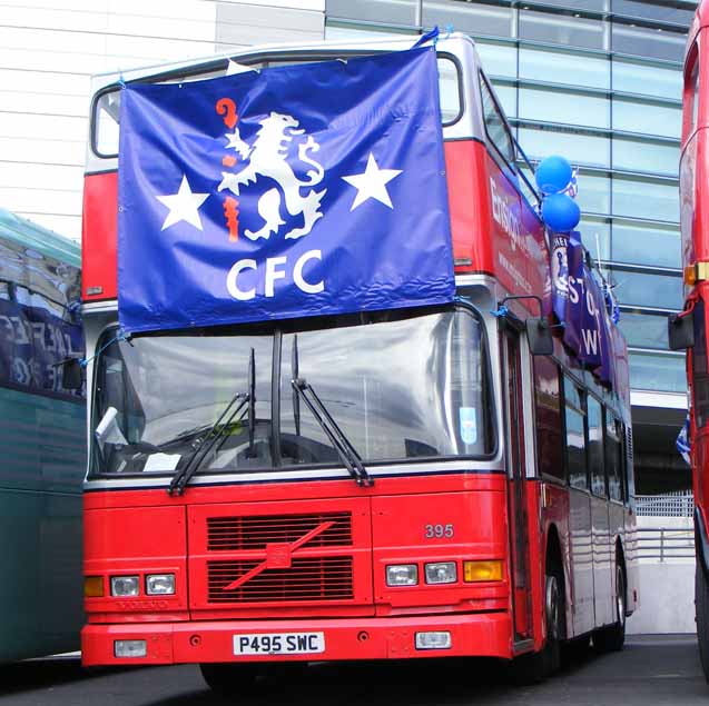 Another Ensign Dublin Volvo Olympian, 395 (P495SWC), has been converted into an open topper in Ensignbus' fleet and treated to their red and silver livery. It used to be RV334 (97D334) and is seen here at Wembley for the 2012 FA Cup final between Chelsea and Liverpool.