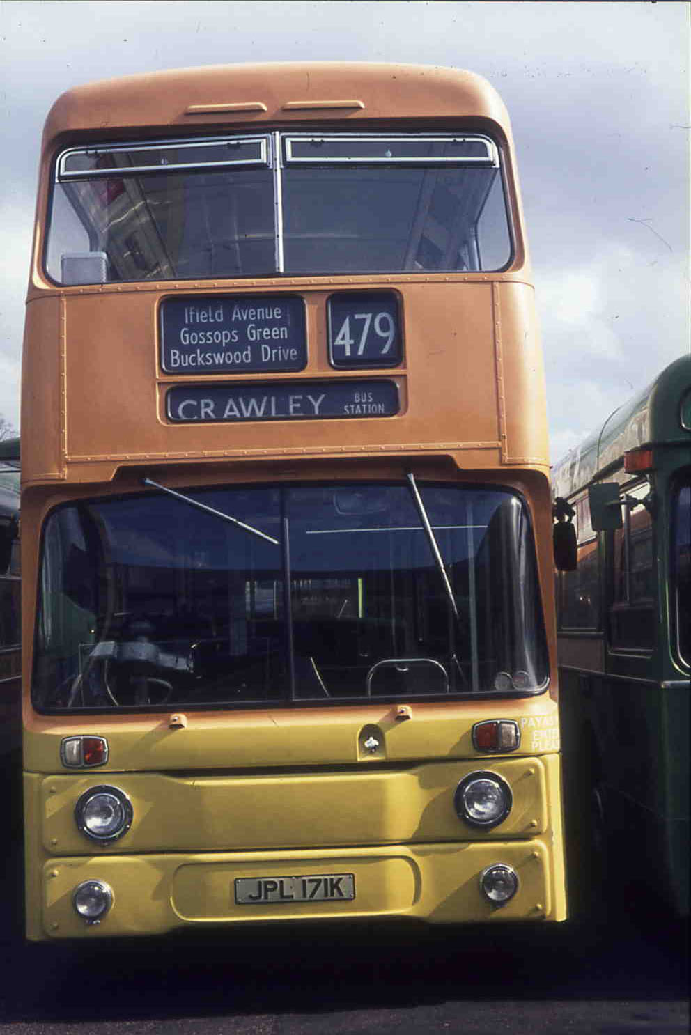 Park Royal bodied Atlantean AN71 (JPL171K) received this special advert livery for Old Holborn in late 1975. It was repainted green in the summer of 1977. This picture sees it in Crawley depot, which is where it was based from new till moving to Garston at repaint.