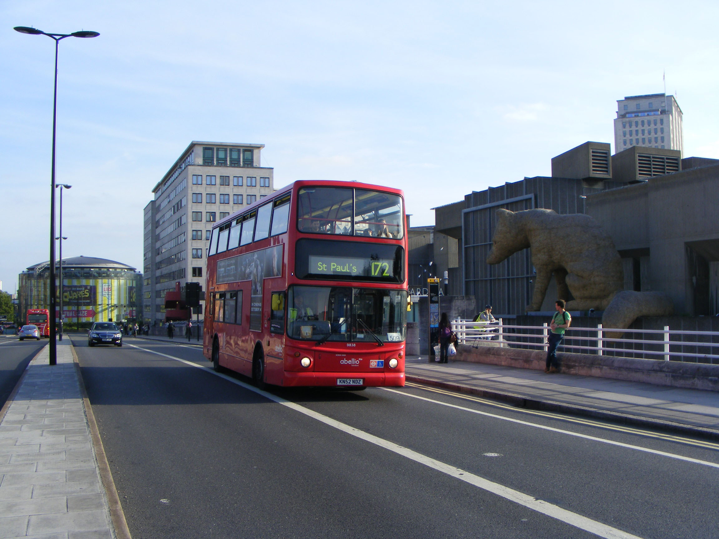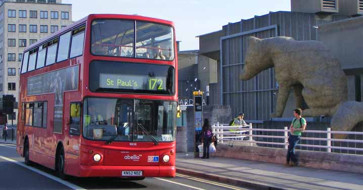 Abellio inherited a large number of Dennis Tridents with Alexander ALX400 bodies, favoured by both Connex and Travel London. Trident 9838 (KN52NDZ) however was new to Armchair as their DT16, but passed to Metroline when they took Armchair over. The batch of ex Armchair Tridents were released by Metroline when their leases expired. The bus is seen crossing the Thames on route to St Paul's (Cathedral) in September 2011. |