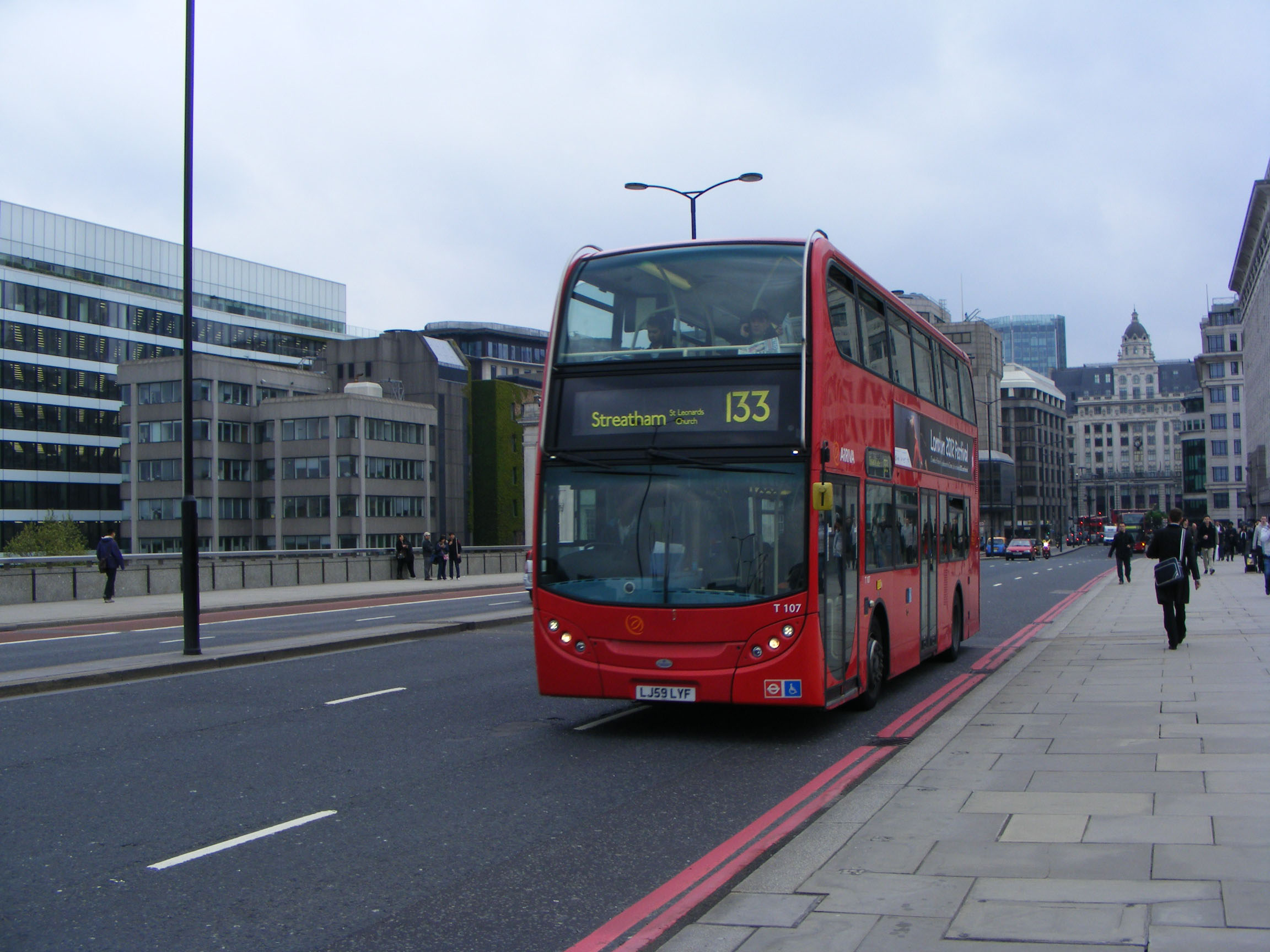 T107 (LJ59LYF) seen crossing south over Waterloo Bridge on the 133 to Streatham early in May 2012.