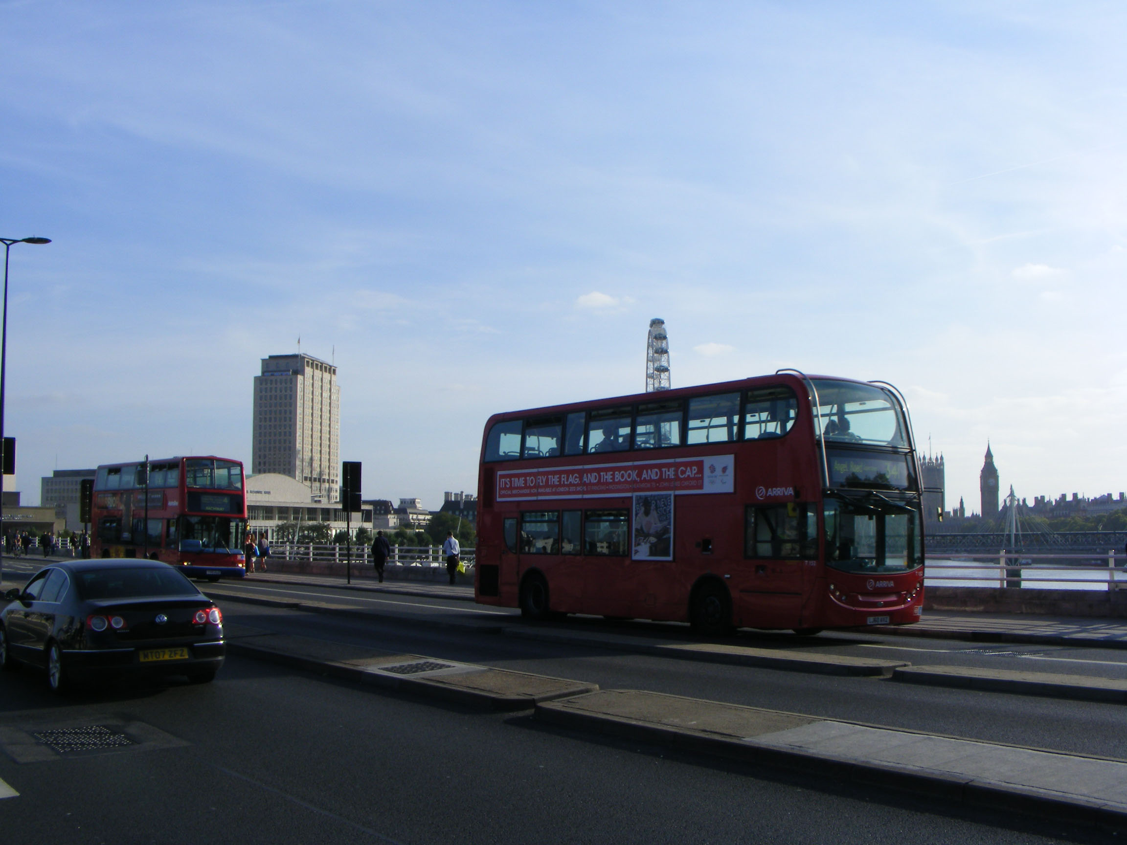 With London icons behind, T152 (LJ60AVZ) is also seen cruising over Waterloo Bridge in September 2011.