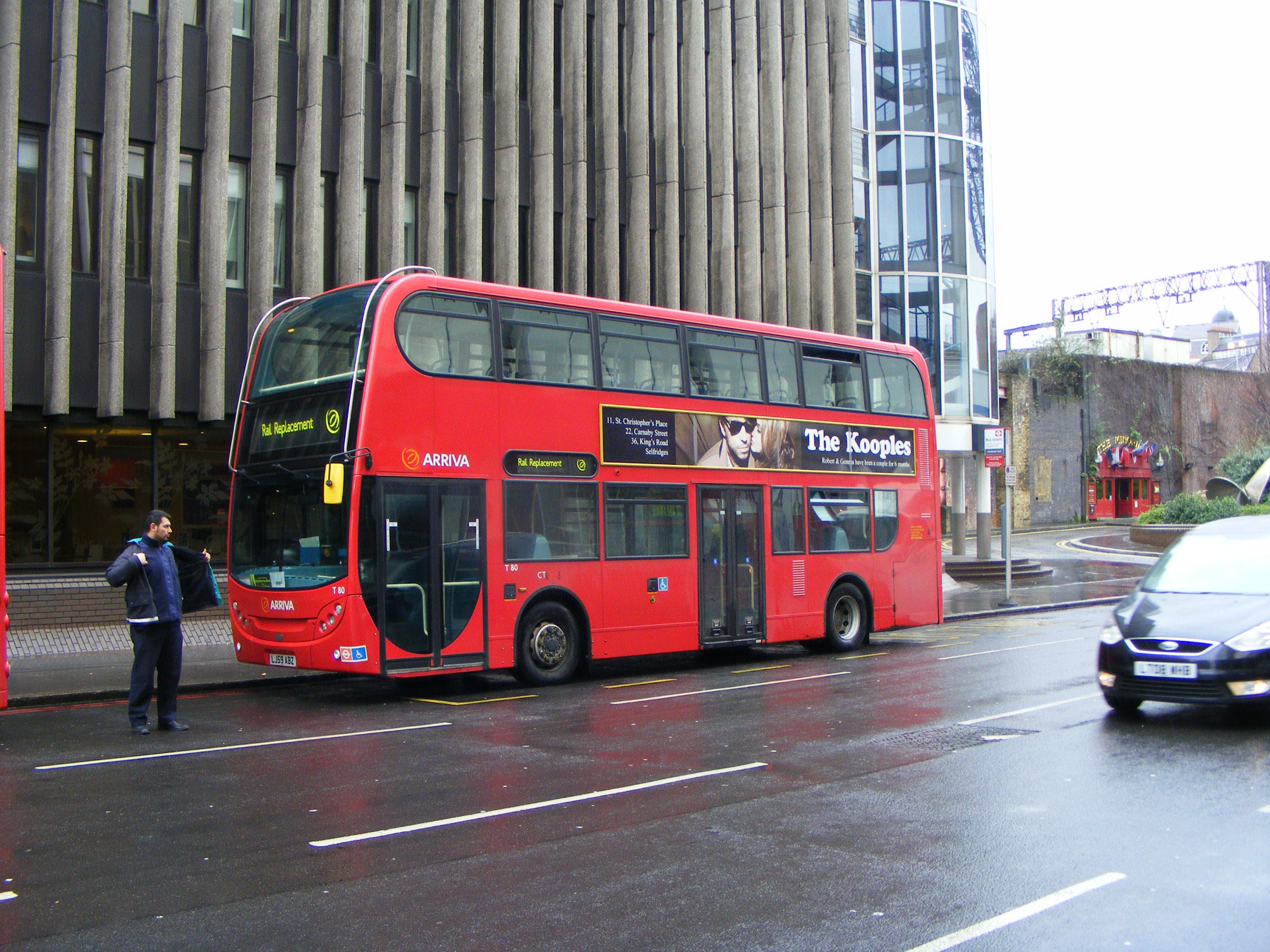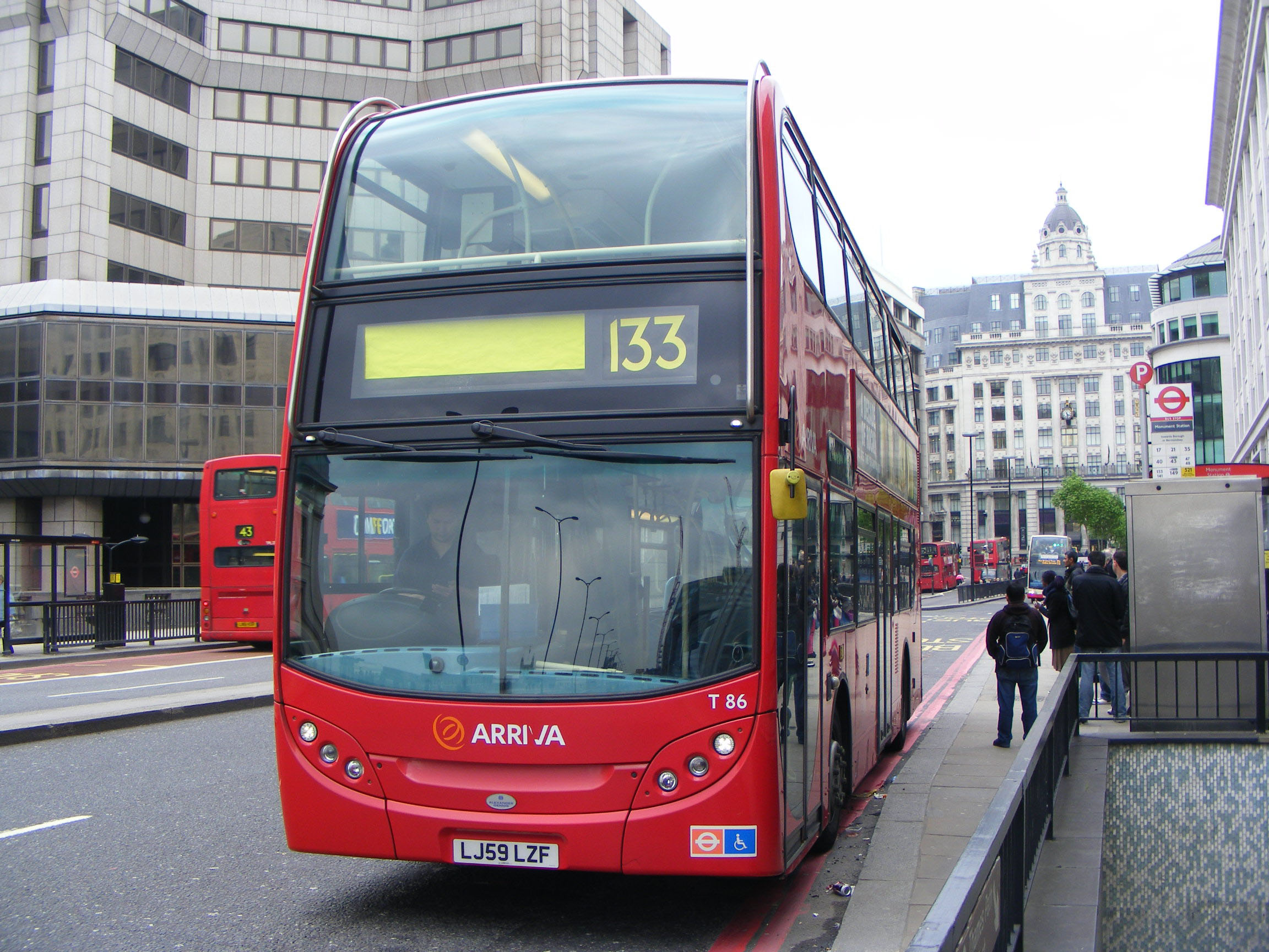 From a later batch, T80 (LJ59ABZ) is seen at work on an intensive Docklands Light rail replacement service provided exclusively by Arriva London in February 2011. The bus is seen near the Tower Gateway terminus.