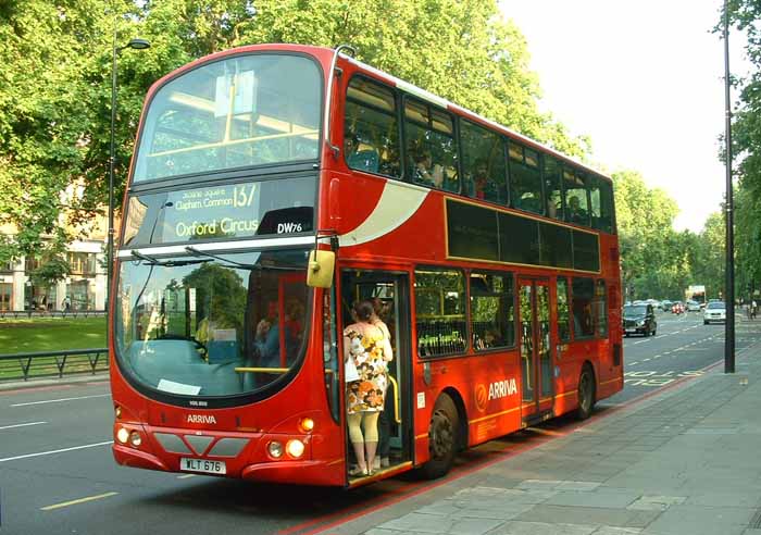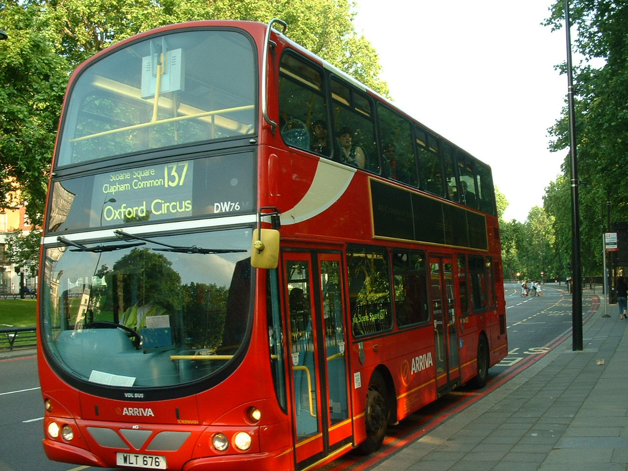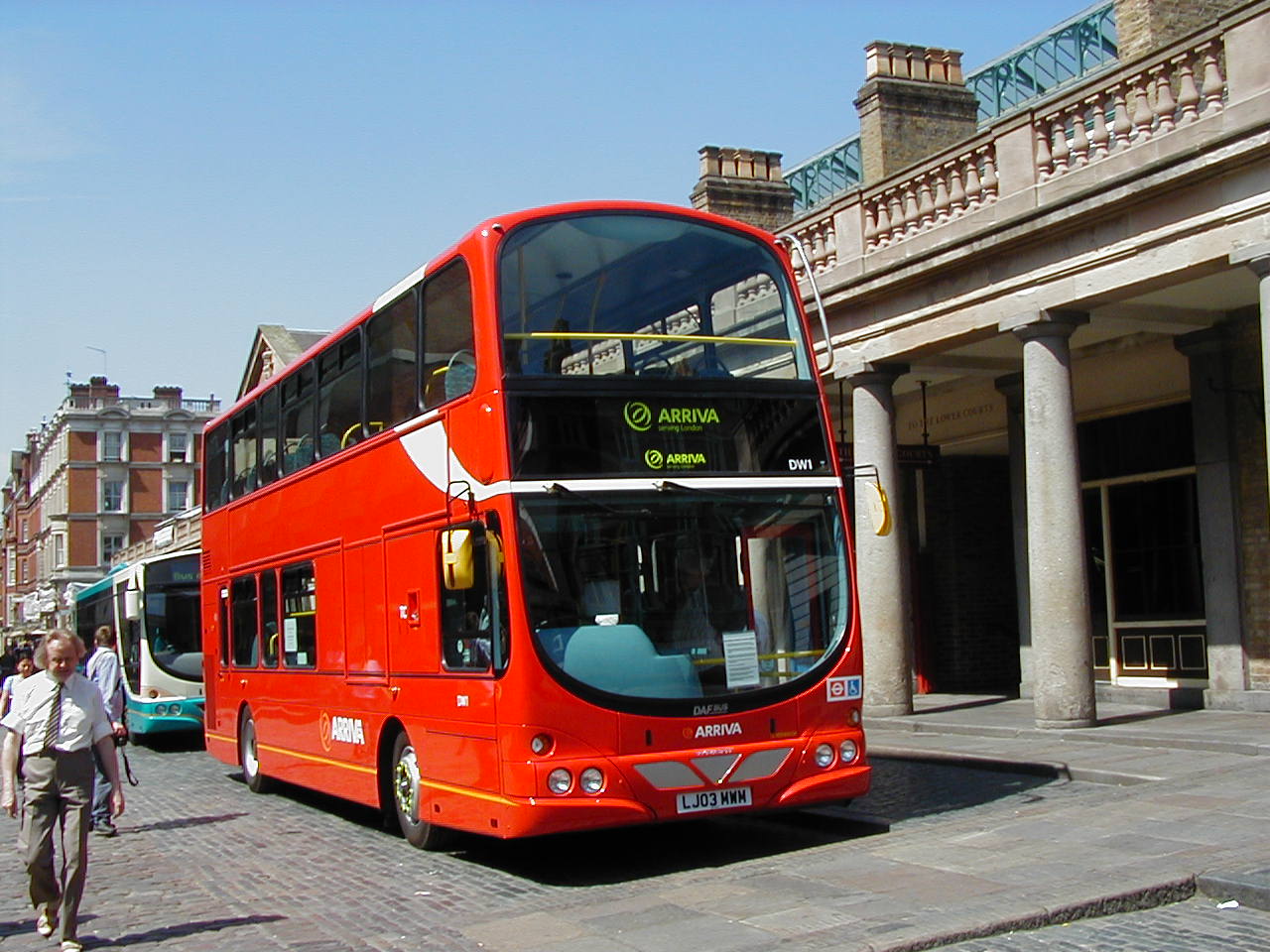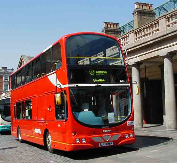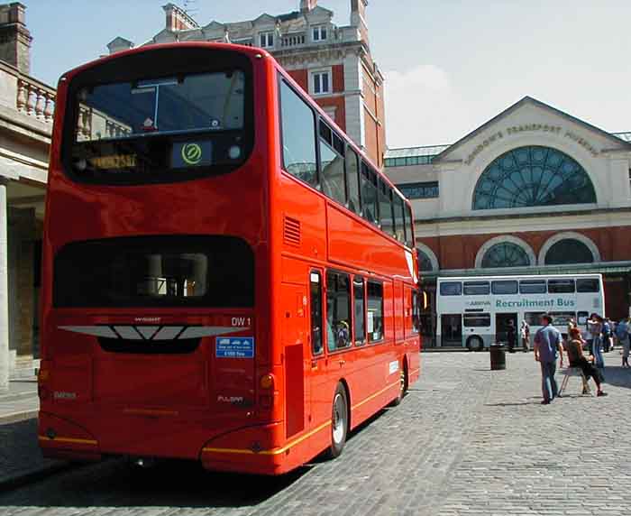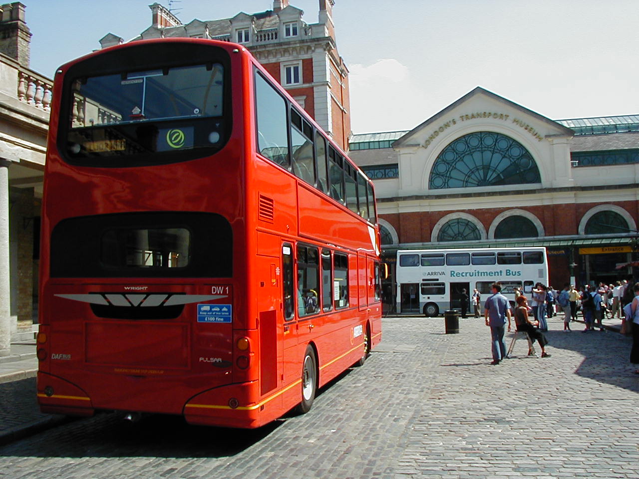 Wright started bodying the DAF DB250LF doubledeck chassis as well as the Volvo B7TL, their only doubledeck offering ever until the DAF. With Arriva's large fleet of DAF DB250s in London, not surprisingly they are the first customer, and the first bus is DW1 (LJ03MWM) seen on display at an Arriva event at the Covent Garden Museum on June 14th 2003. Whereas the Gemini doubledeck body on the Volvo is known as the Eclipse, for the DAF it is designated the Pulsar. Behind DW1 is Arriva Midland Red North's "Bus of the Future".