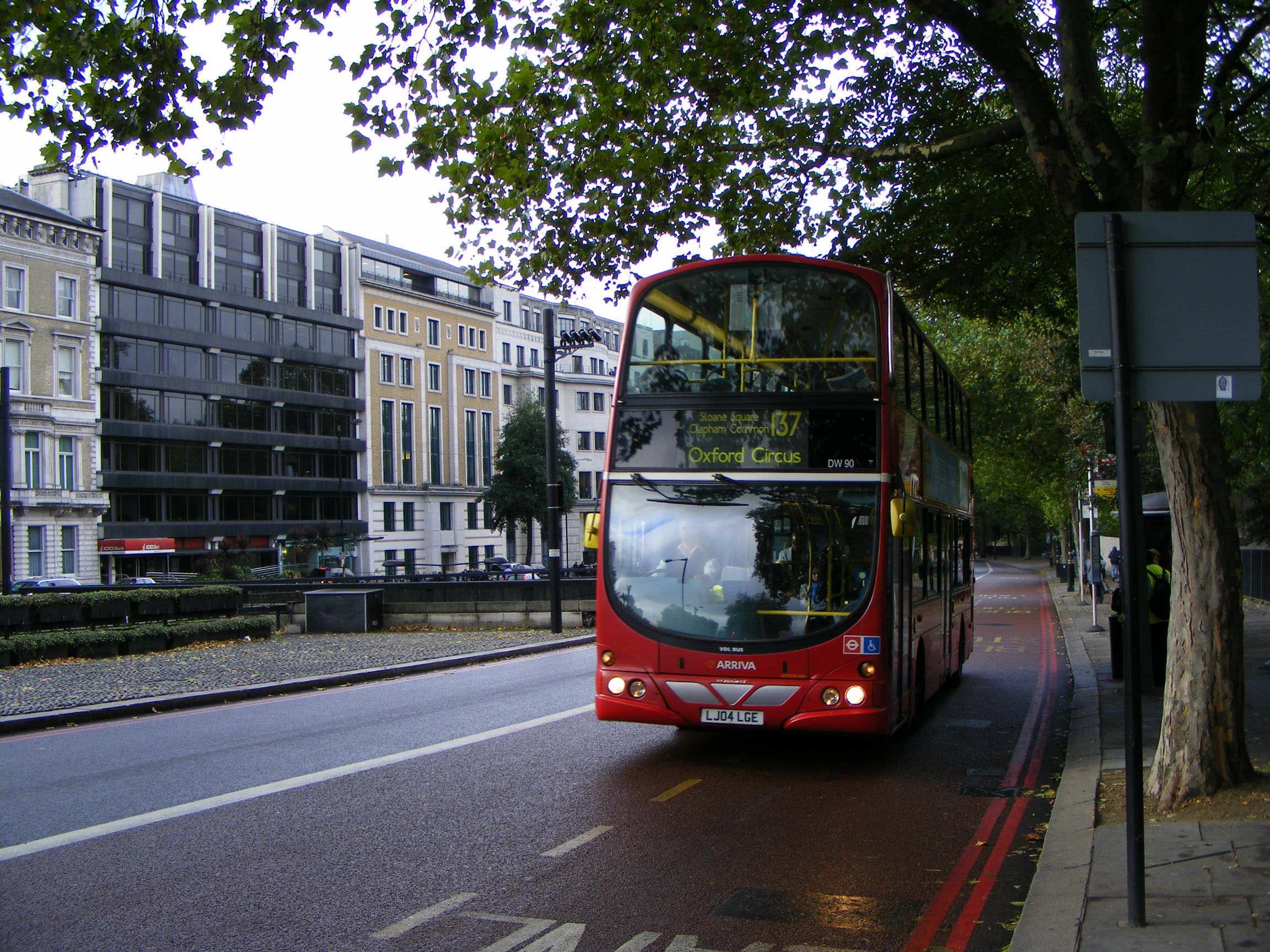 Heading for Oxford Circus on the 137 in October 2010 is VDL DB250LF Wright DW90 (LJ04LGE) stille sporting cow horns in its original livery.