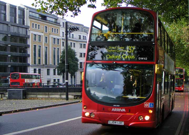 At the same spot by Hyde Park Corner on the same day and on the same route is DW62 (LJ04LDC) which has clearly been in for a repaint. The cow horns have gone and even the silver grill has been given the all-over red treatment - there seems no escape!