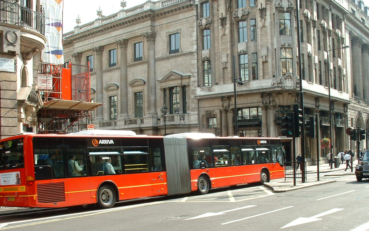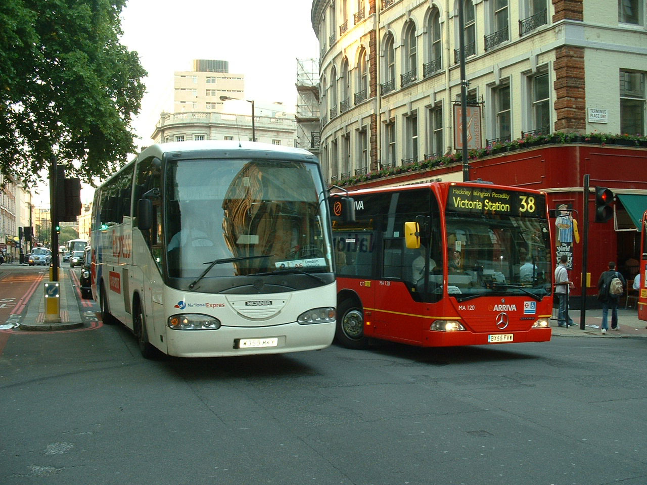 This time it is a coach overtaking a bendi, this Scania/Irizar Century was new to Forsyth of Glasgow. It is seen on Stansted route A6 in Victoria in June 2007 alongside Arriva bendibus MA120 (BX55FVW).