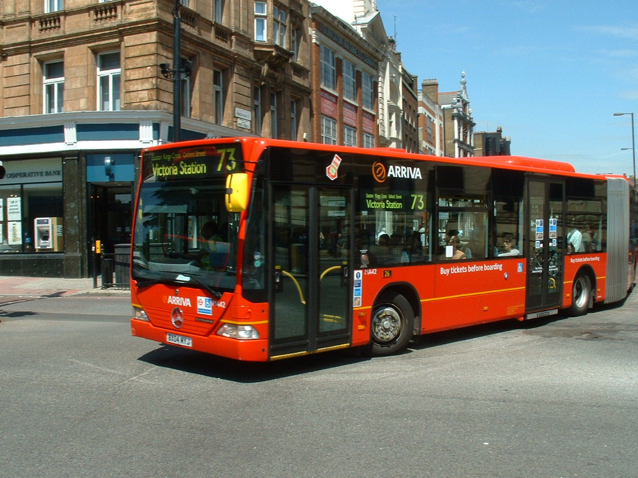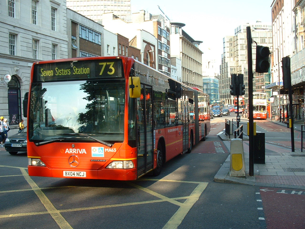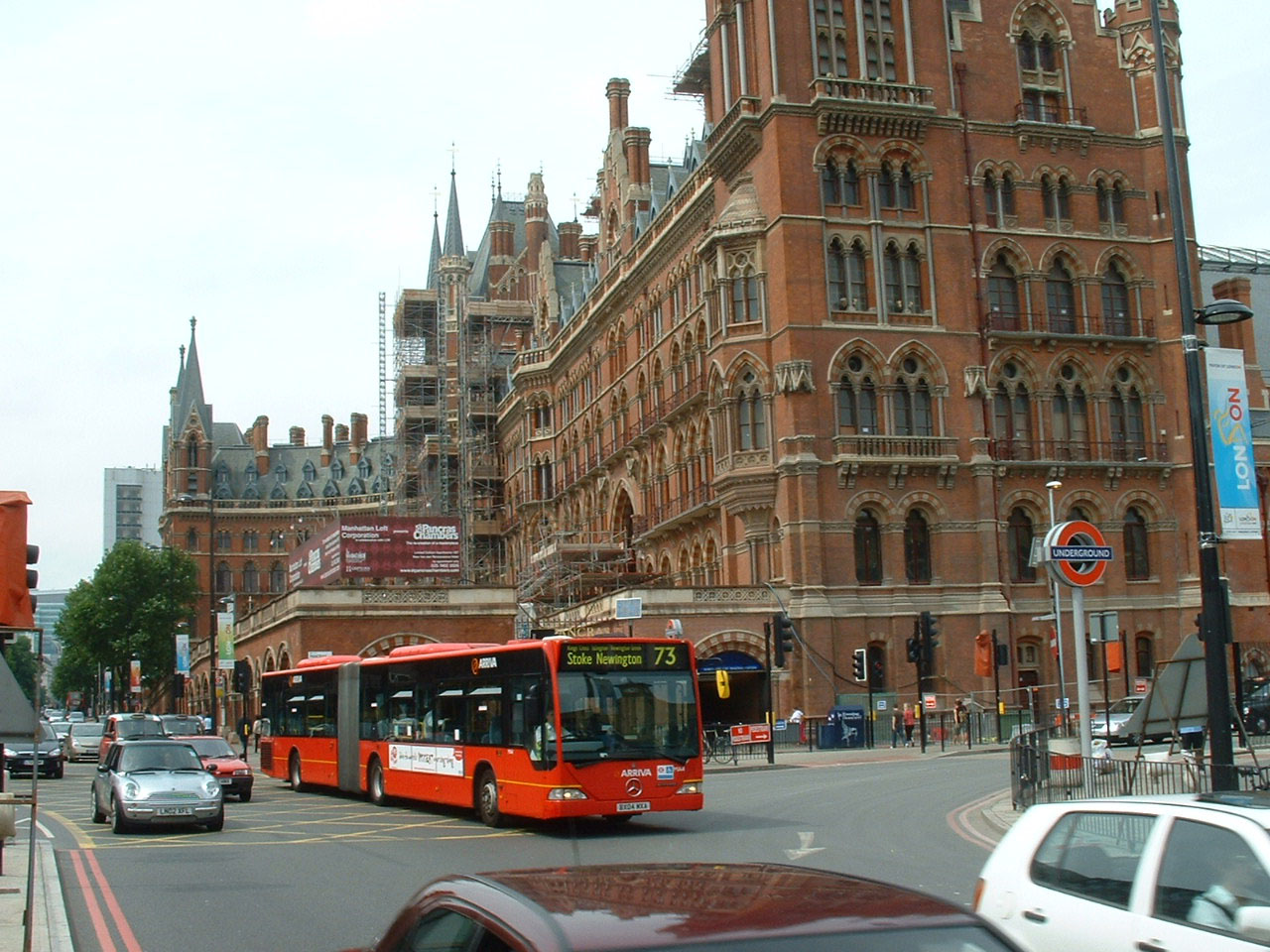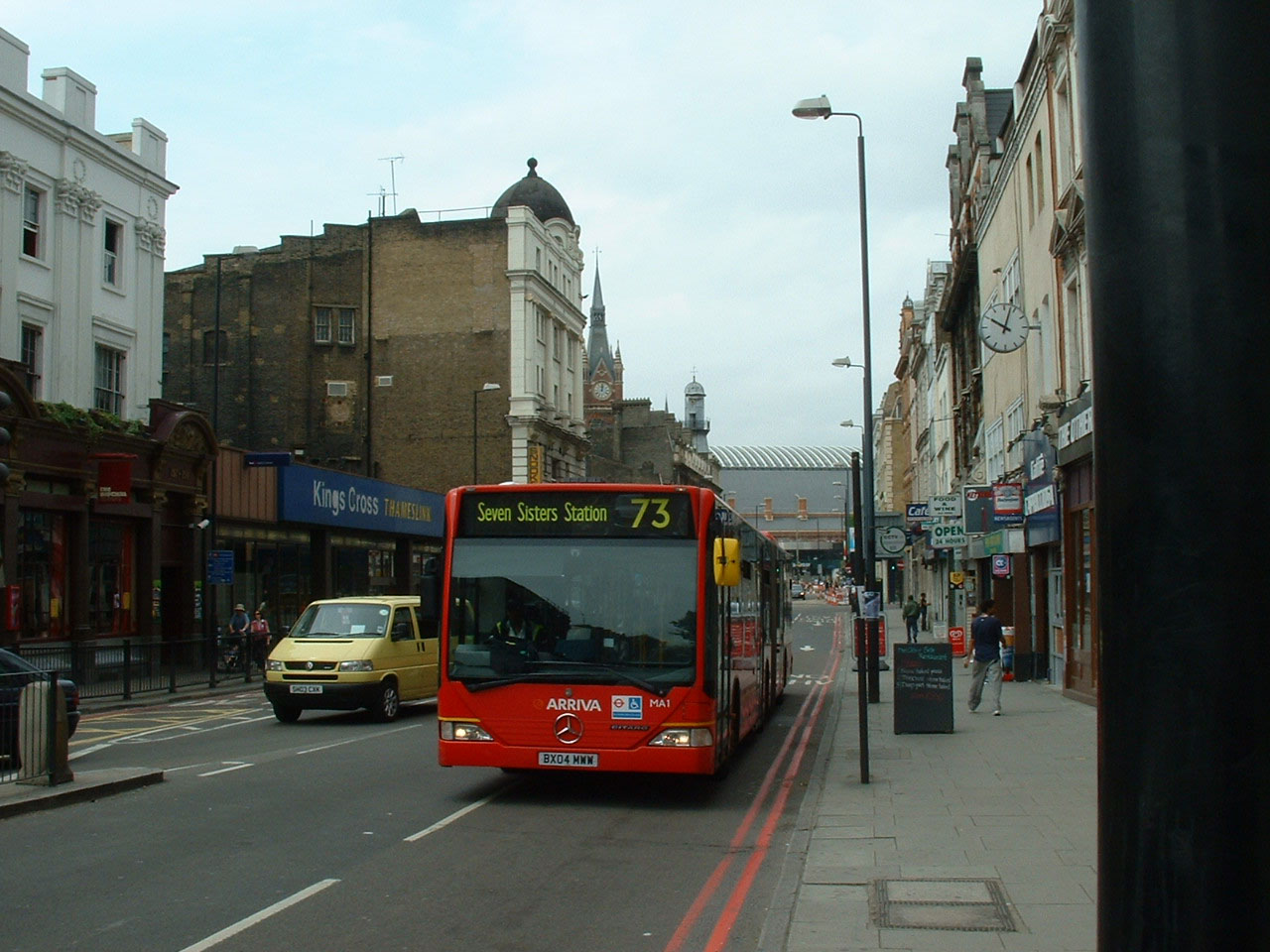 With restoration work nearly completed on St Pancras in readiness for Eurostar services, MA4 (BX04MXA) passes by on the 73 in summer 2007.