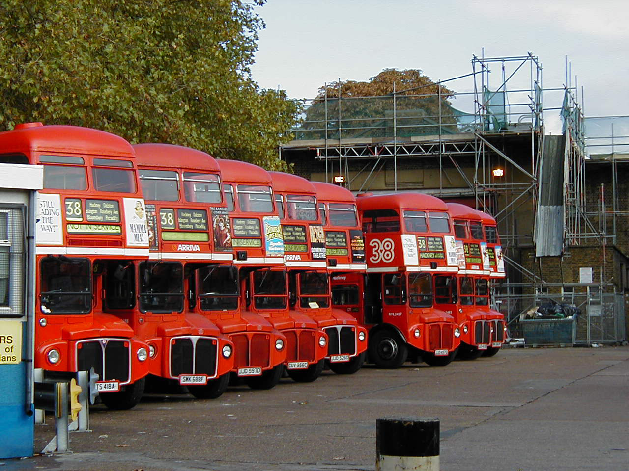 Clapton depot forecourt in 2003 and resting RML Routemasters are lined up awaiting service.