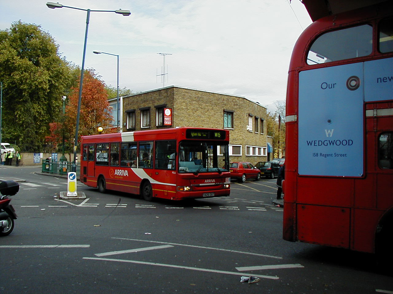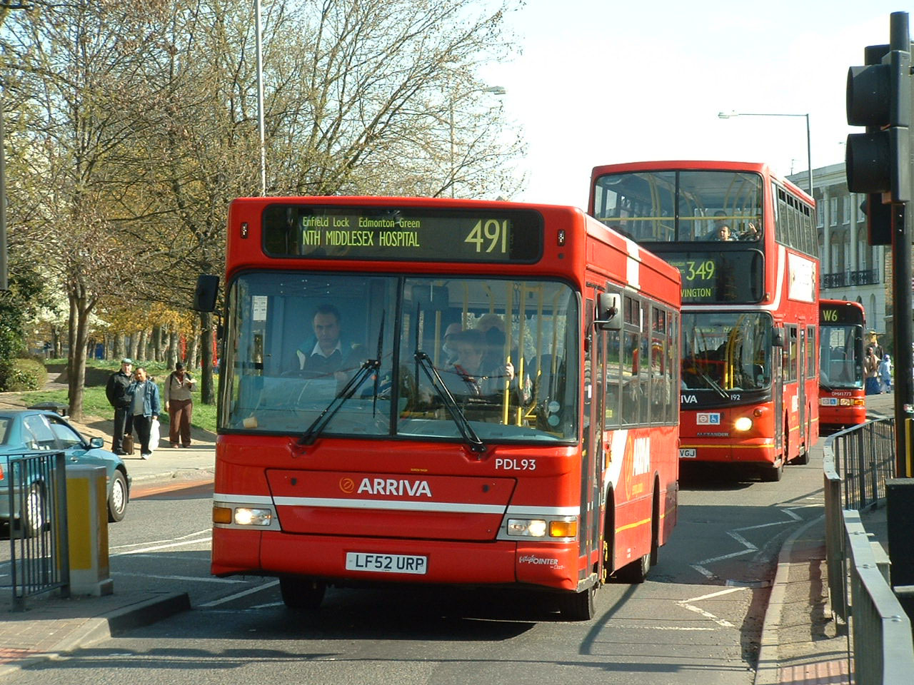 PDL5 (V425DGT) in Walthamstow Bus Station is one of a small number of low floor singledeckers in the Arriva London fleet. It is an 8.8 metre Dennis Dart MPD with Plaxton Pointer 2 bodywork.