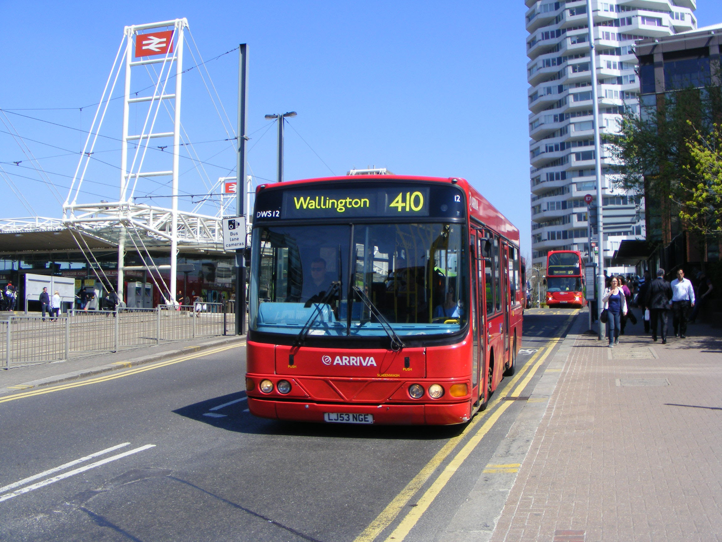 Outside East Croydon Station minus cow horns in May 2013 is Wright Cadet bodied DWS12 (LJ53NGE), another DAF SB120. A Metrobus East Lancs Omnidekka bodied Scania N94UD on the 119 approaches behind. |