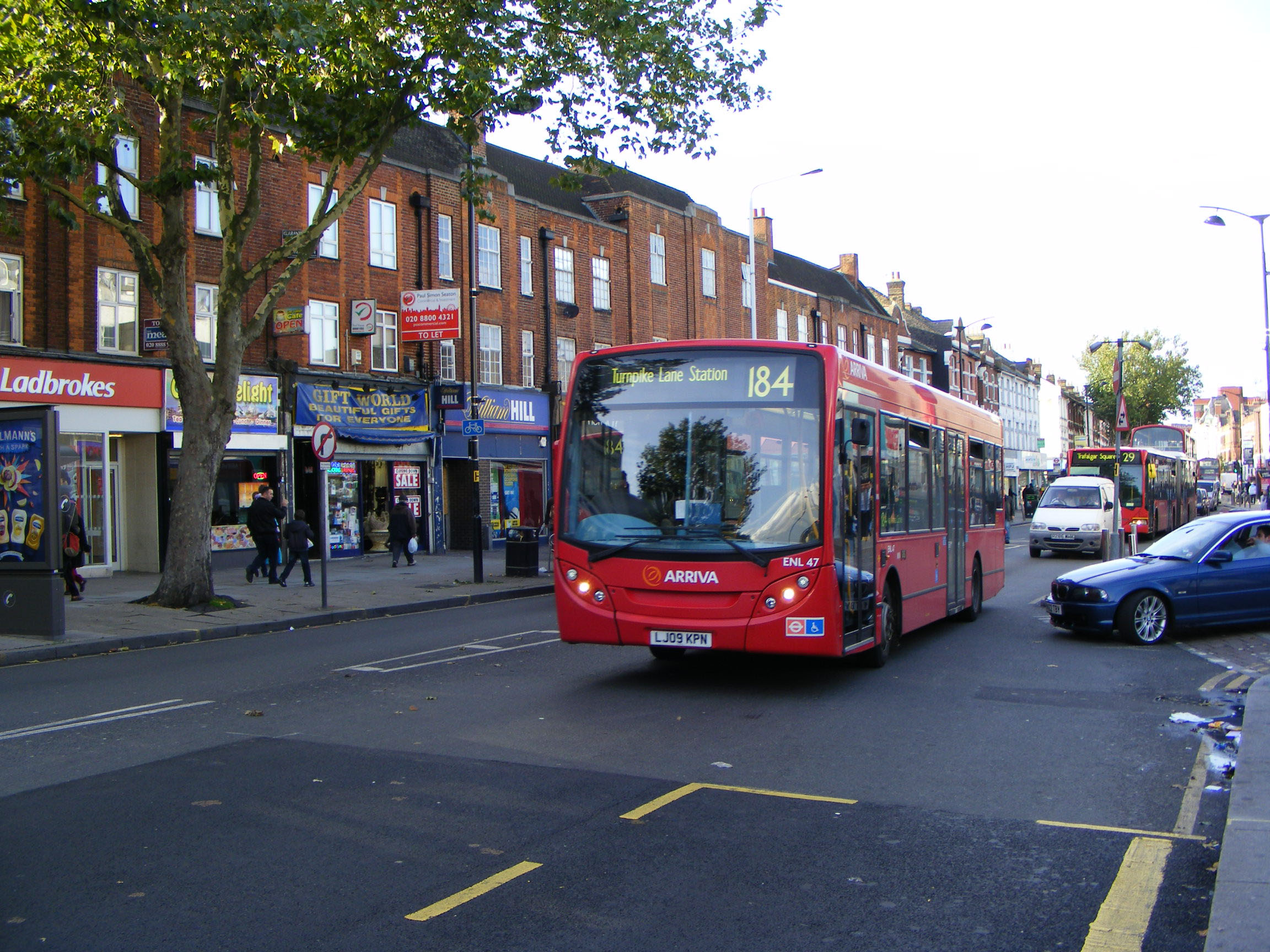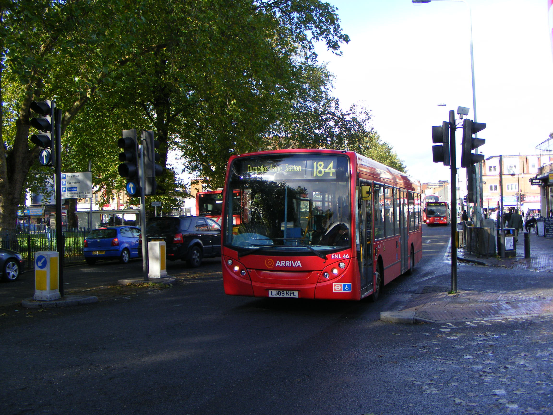 Sister vehicle ENL46 (LJ09KPL) is seen arriving at Turnpike Lane Station on the 184 some 16 months later.