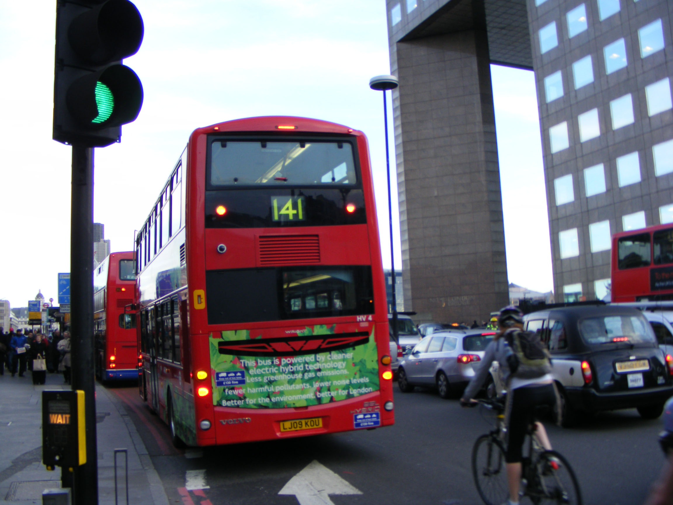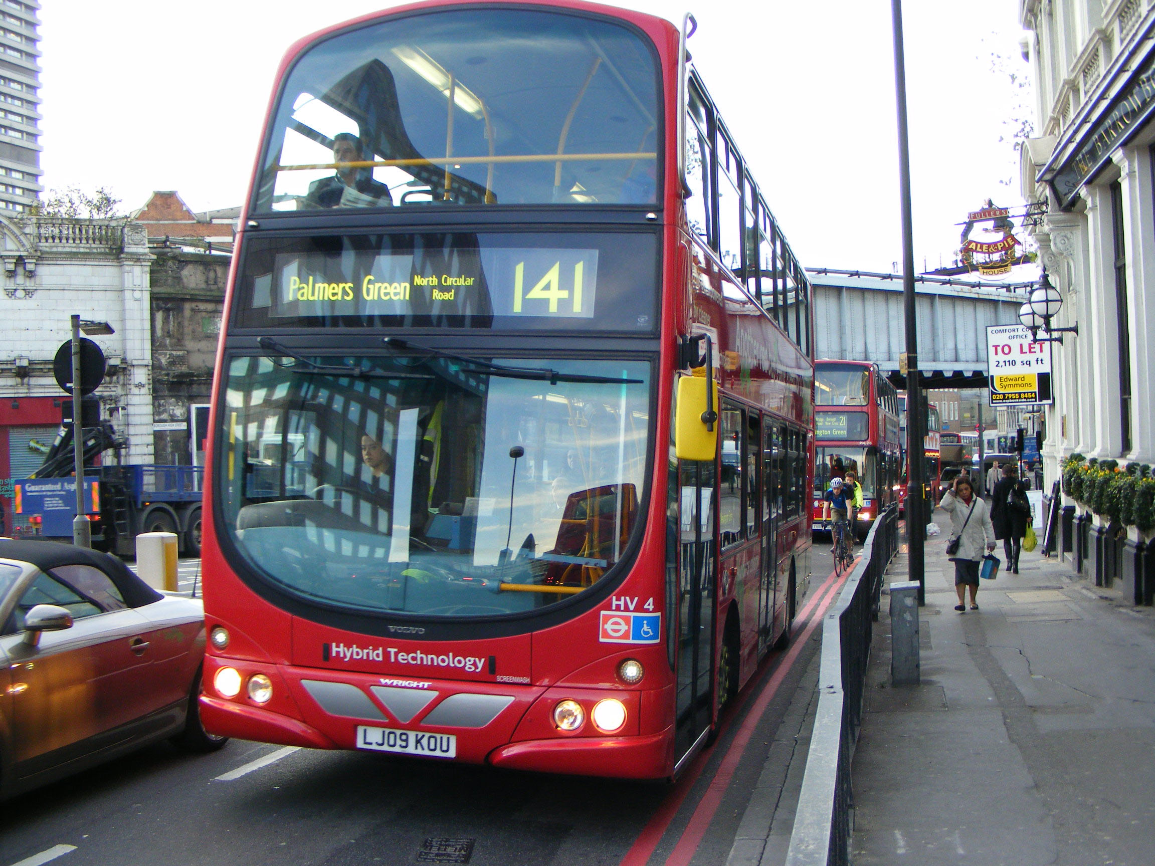 Seen near London Bridge Station in Autumn 2009 is HV4 (LJ09KOU) one of the few hybrid buses in service in the capital with Arriva in the first wave of hybrids. The Wright Eclipse Gemini 2 body is on a Volvo B5LH hybrid chassis.