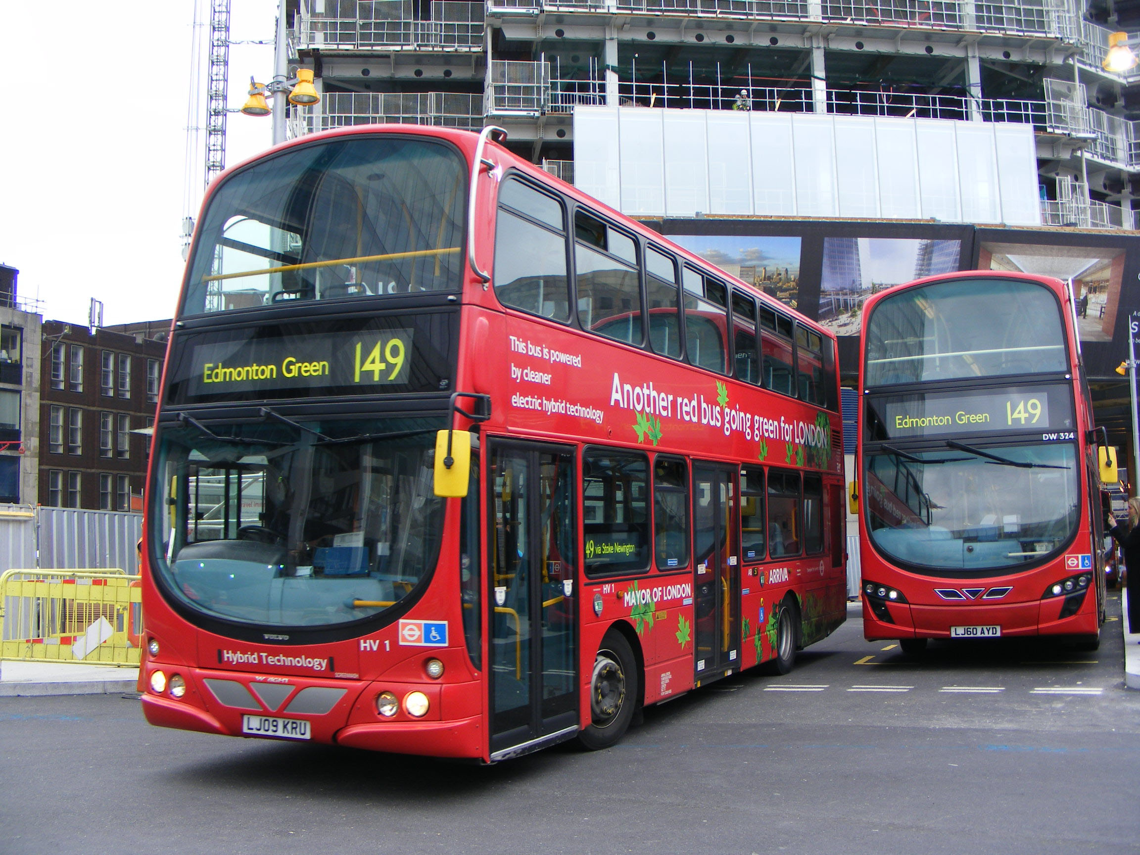 The first of the hybrid batch, HV1 (LJ09KRU) is seen in May 2012 with Wright Gemini 2 DW324 (LJ60AYD). Both are amidst the hiatus of reconstruction taking place at London Bridge Station.
