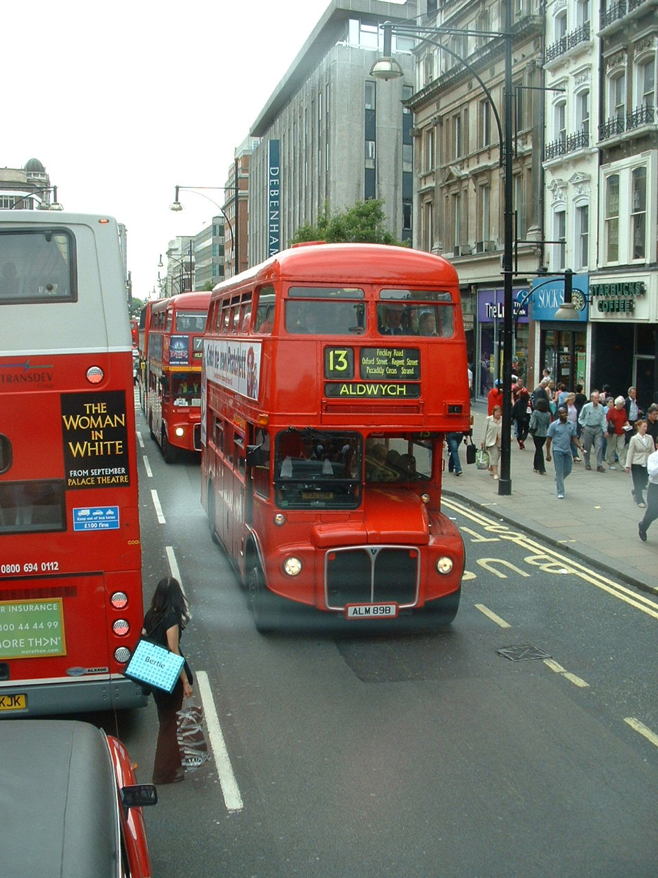 Refurbished Marshall bodied RM2089 (ALM89B) is seen in Oxford street on the 13 on June 4th 2004, the last day of Routemaster operation by Stagecoach on route 8.