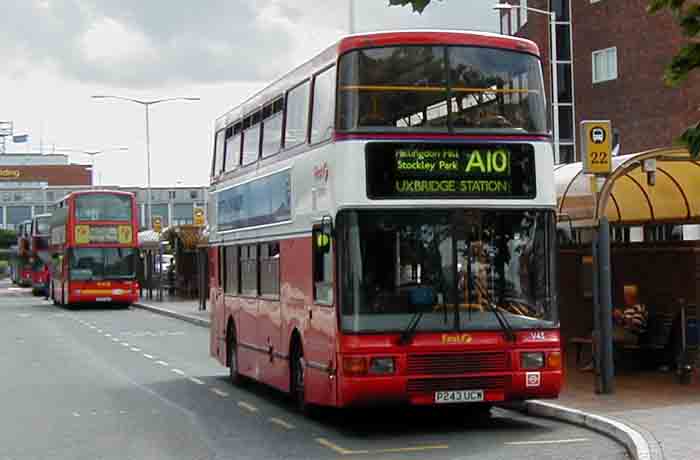 Uxbridge's Palatine II Olympians were normally on the 607 Uxbridge - Shepherds Bush Express, but as some of the early low floor Darts used on the Heathrow Direct service between Uxbridge and the Airport had left the fleet, the Olympians had been appearing on the A10. Here is V43 (P243UCW) waiting departure from the Airport.