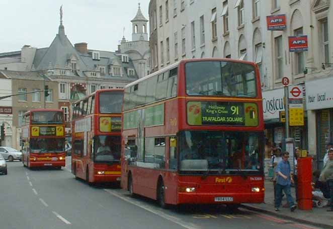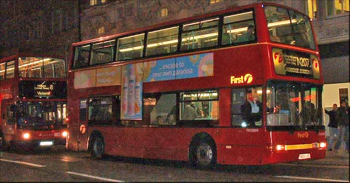 TN33809 (T809LLC) is seen similarly liveried in May 2008, with the between headlamp yellow strip retained too. The bus is on night service N207 heading for Uxbridge, but unlike the daytime 207 which starts at Shepherds Bush, the N207 kicks off at Trafalgar Square and TN33809 is seen in Oxford Street.