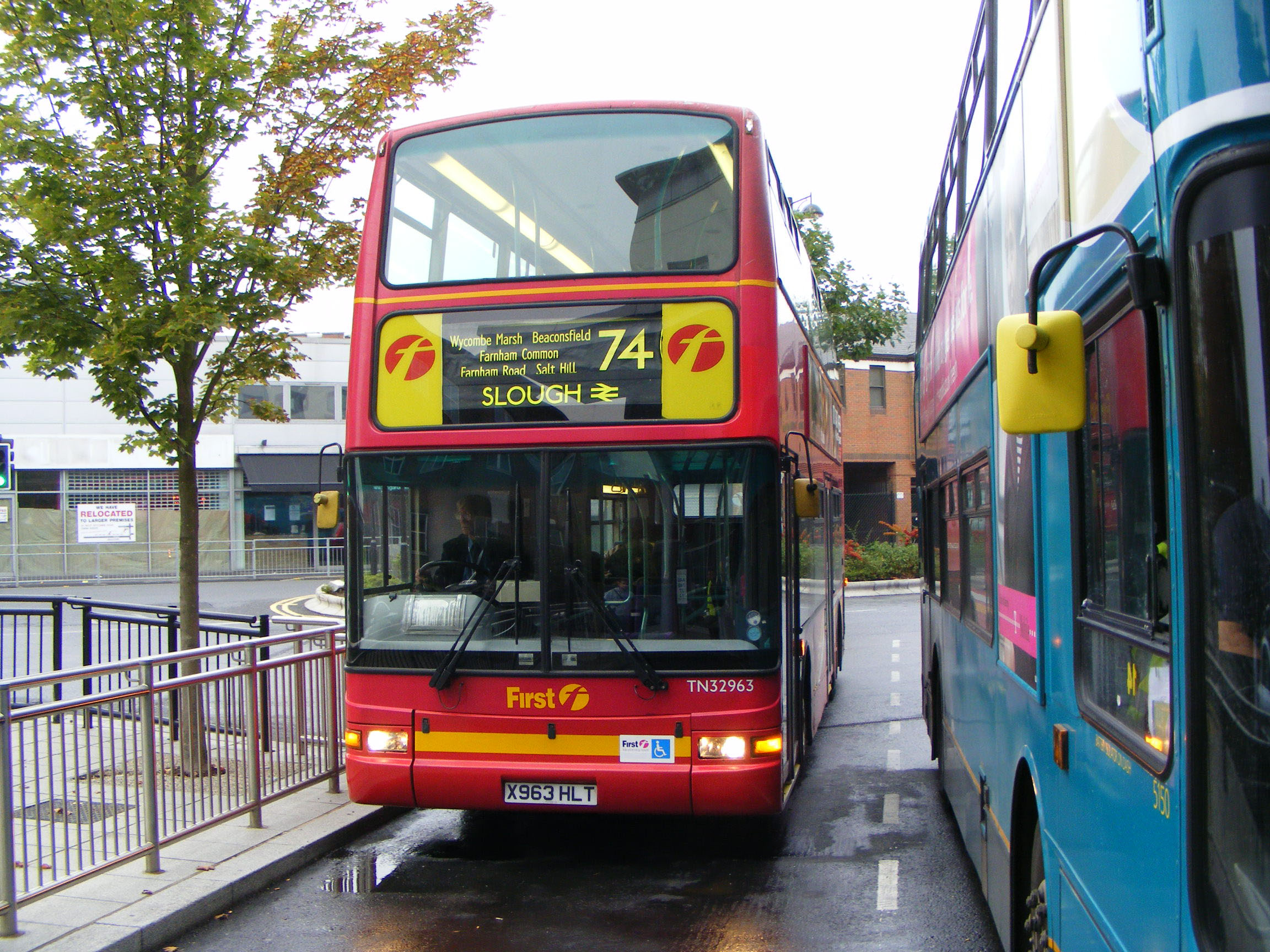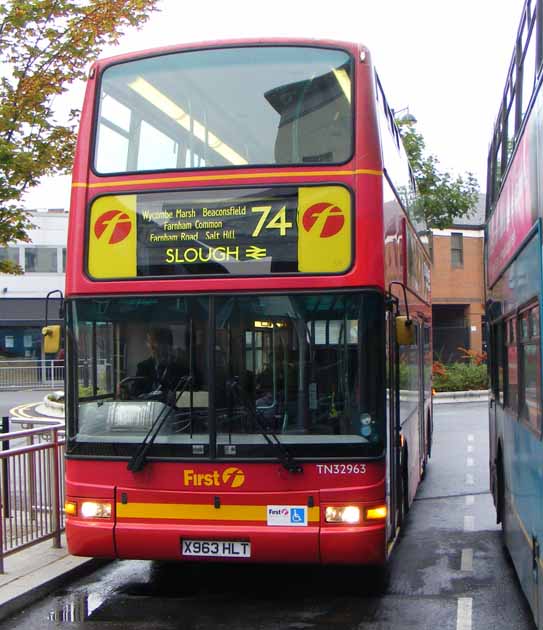 In full London livery, Trident TN32963 (X963HLT), is seen in Wycombe Bus Station on the 74 to Slough in October 2009.