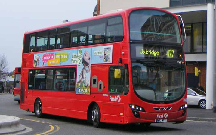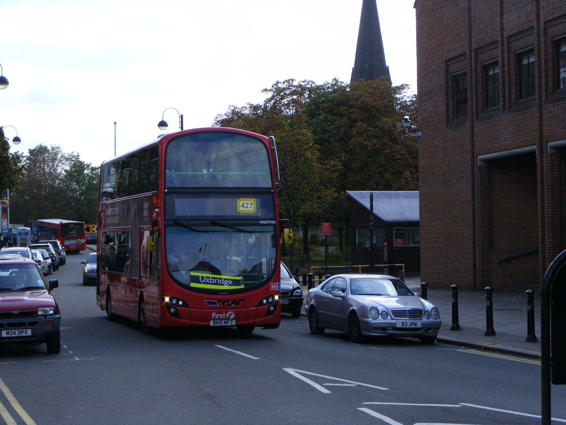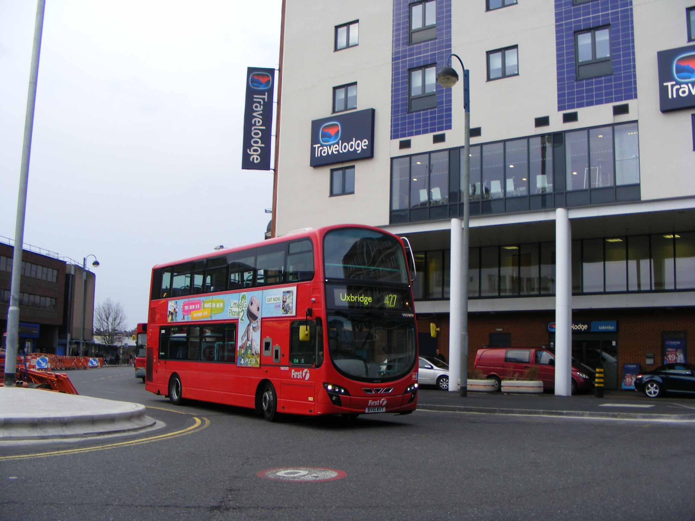 Dennis Tridents were ousted from the 427, the west end of the old 207 route between Uxbridge and Acton, by new Volvo B9TL Wrights. VN37870 (BV10WVT) is seen arriving in Uxbridge in March 2011.