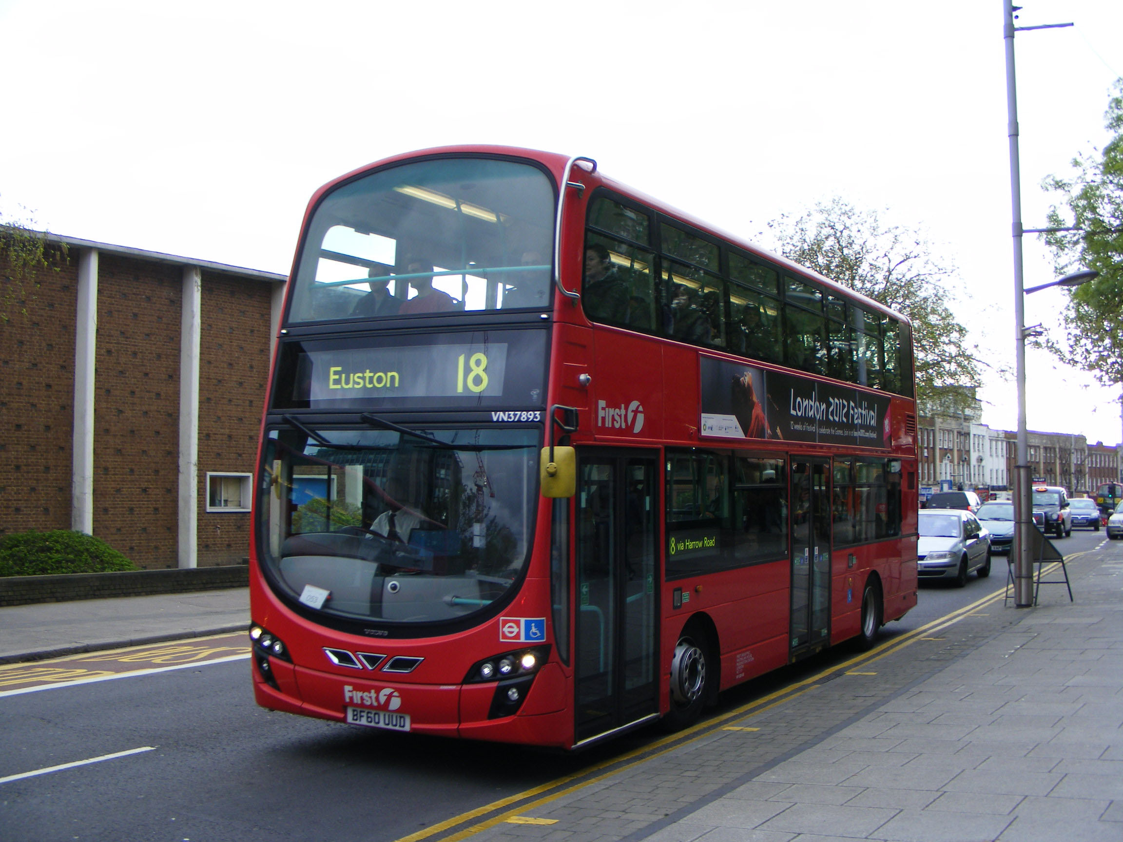 Volvo VN37893 (BF60UUD) is seen in May 2012 on the 18 having ousted bendibuses from the route.