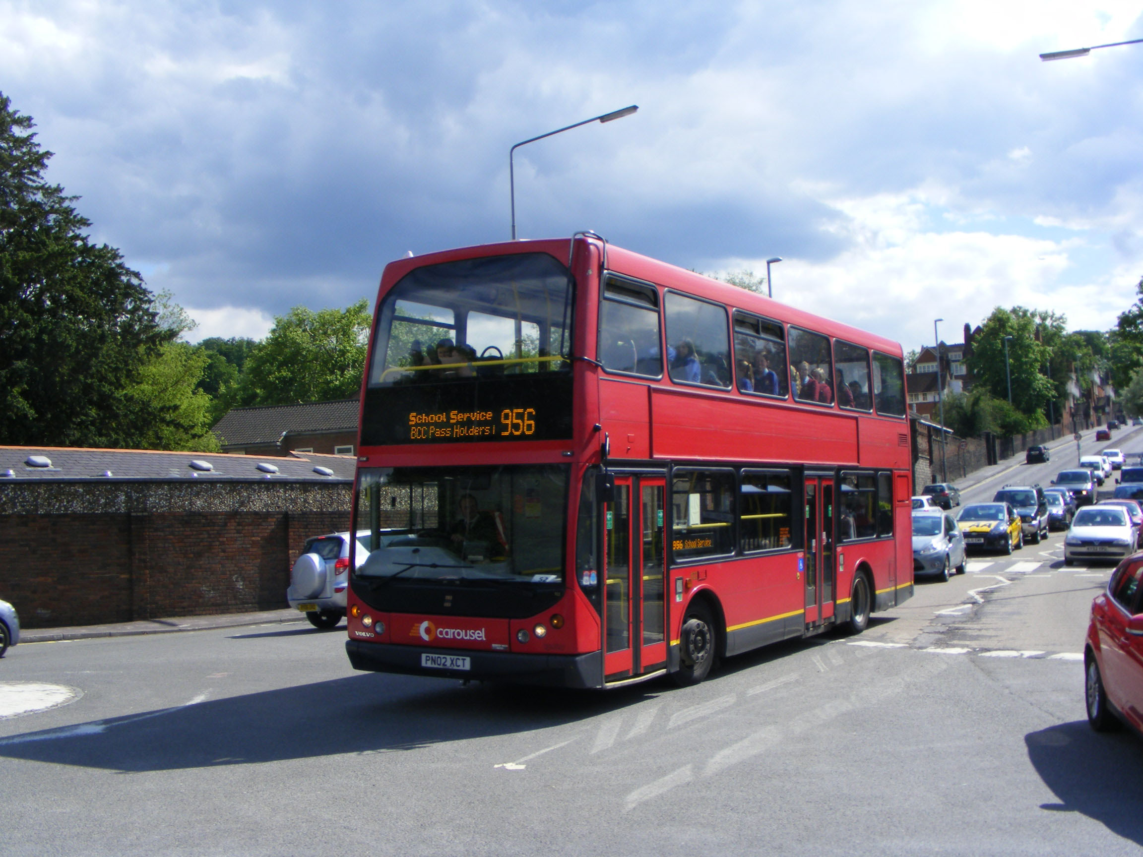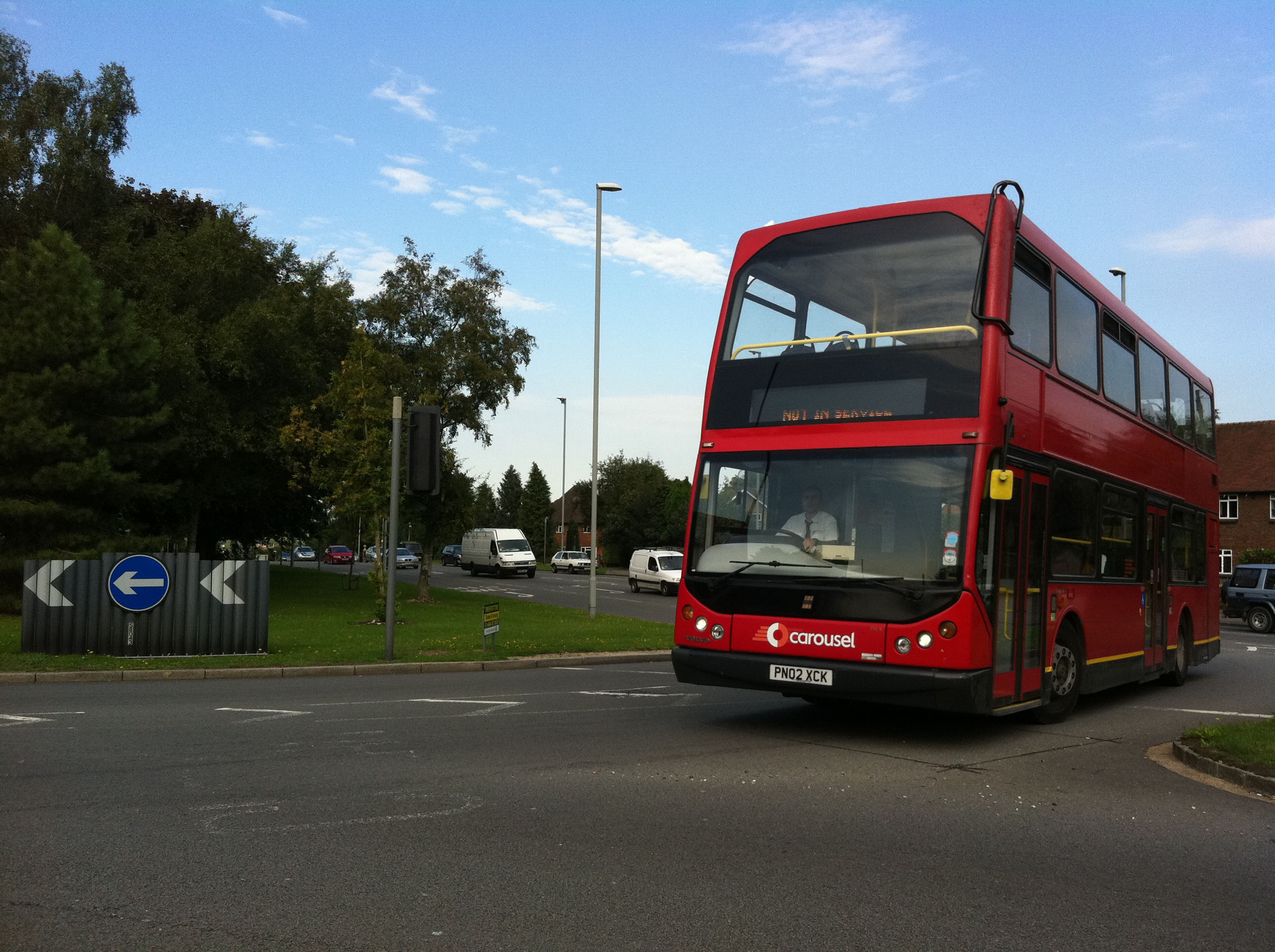 At the foot of Marlow Hill in June 2012 is former EVL33 (PN02XCT), no longer an EVL as Carousel Buses fleetnumbers were integrated into the Oxford scheme on acquisition by Go-Ahead. It has become 922 in the series reserved for Oxford buses that are unable to get under the Oxford Station rail bridge on the Botley Road out of the city. |