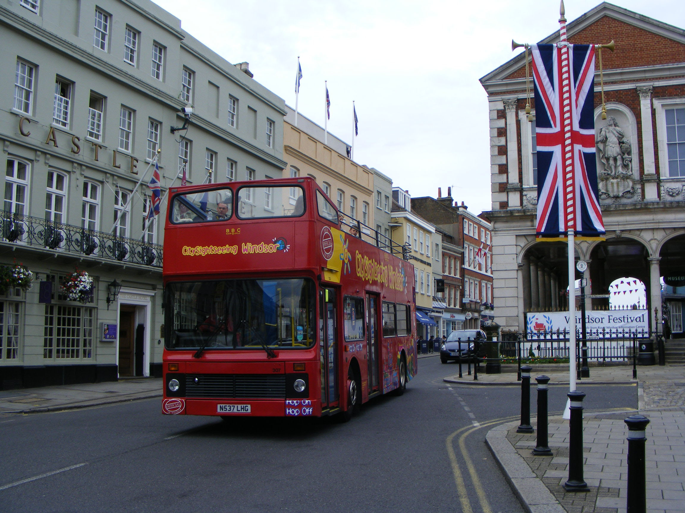 This Northern Counties bodied Olympian has lost its top for City Sightseeing tours of Windsor, where it is seen on August 1st 2012. Ex London Central NV34 (N537LHG) is now 307 in RATP's City Sightseeing fleet. |