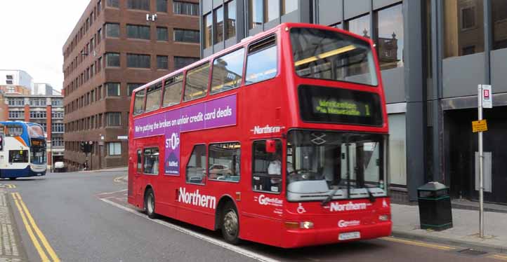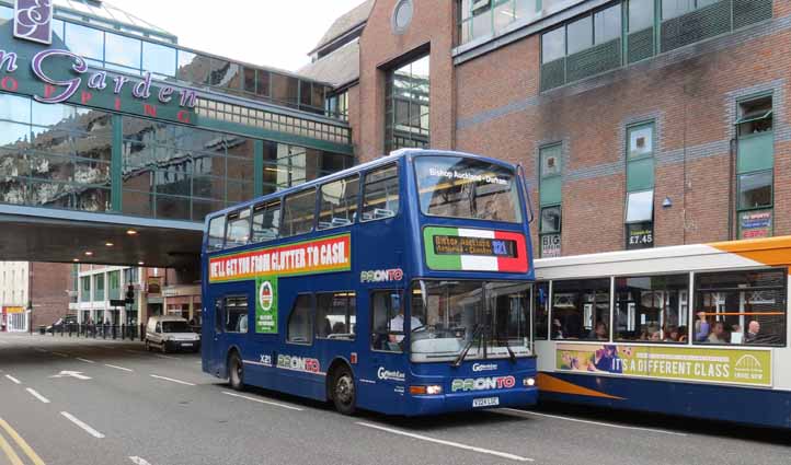 Several of the Plaxton President bodied Volvo B7TL buses were transferred north to Go-North East. They were painted in dark blue for Pronto branded services, which accounted for the red, white and green Italian markings. This is former London Central PVL24 (V324LGC), Go-North East 6024, seen in Newcastle in August 2014. Picture ref A4872 |