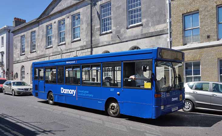 Seen in beautiful sunshine on the last day of June 2015, which was trying to make up for the the other 29 days, is Damory Plaxton Pointer bodied Dennis Dart SLF 3237 (P737RYL), formerly London General LDP37. It is seen in the Dorset county town of Dorchester sporting Damory's simplified new livery. Picture ref B78 |